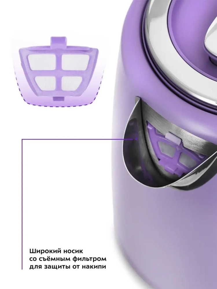 Чайник автоматически отключается при закипании, имеет защиту от перегрева и от включения без воды. В носике чайника расположен съемный фильтр от накипи. Фильтр фиксируется и плотно прилегает к внутренним стенкам чайника, так что накипь не сможет проскользнуть мимо мелкой сетки фильтра.
