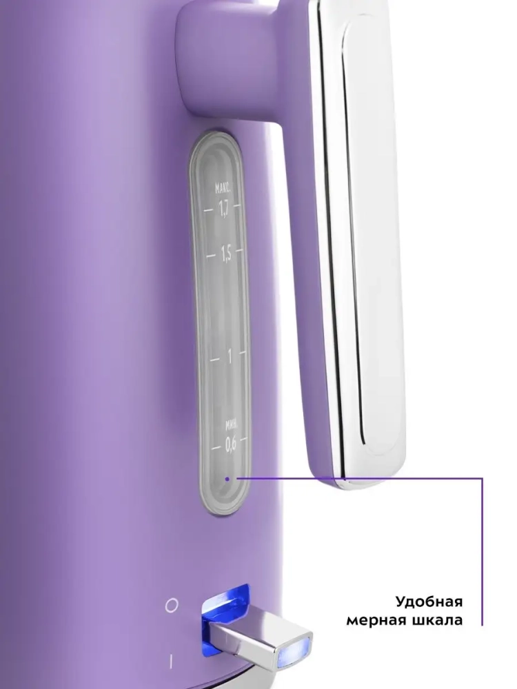 Корпус чайника металлический. Крышка и подставка выполнены из приятного на ощупь пластика. Мерная шкала находится под ручкой. Ручка чайника пластиковая, не нагревается и удобно лежит в руке. Внутренняя поверхность чайника выполнена из нержавеющей стали, благодаря чему вода не соприкасается с пластиком.