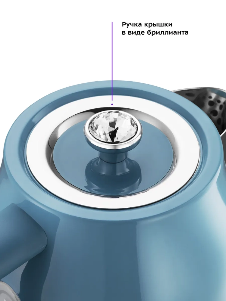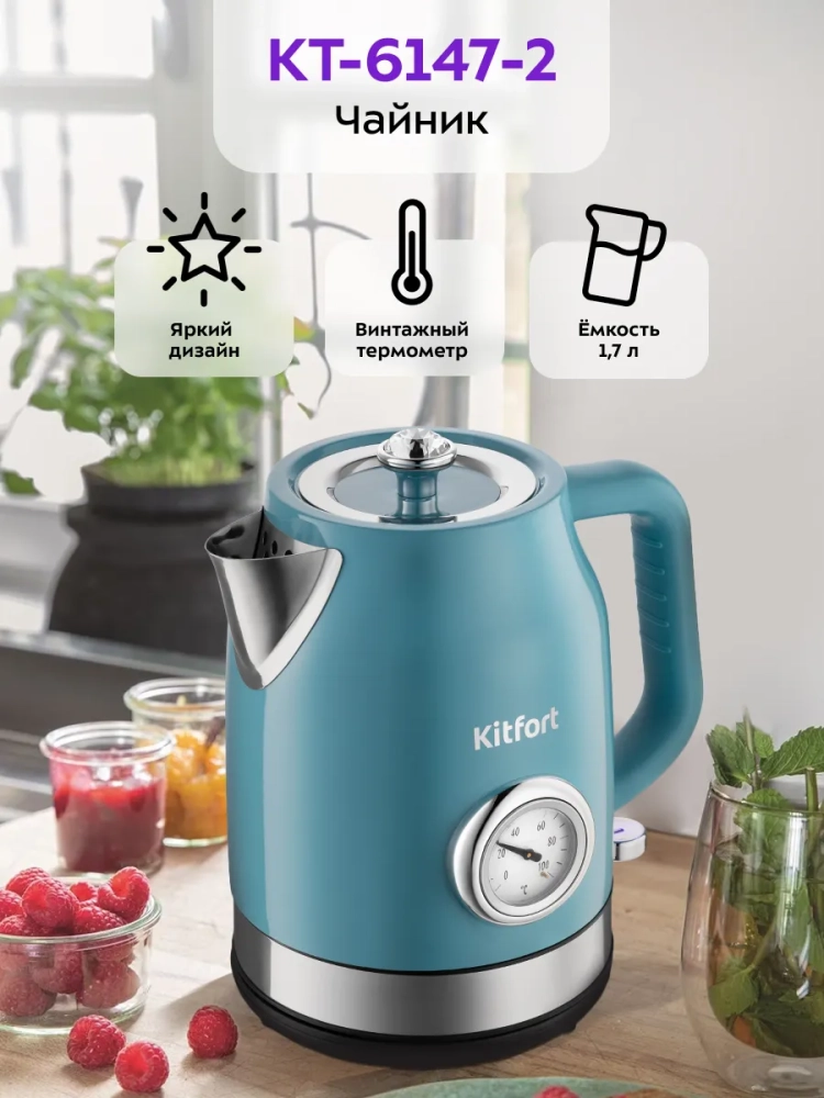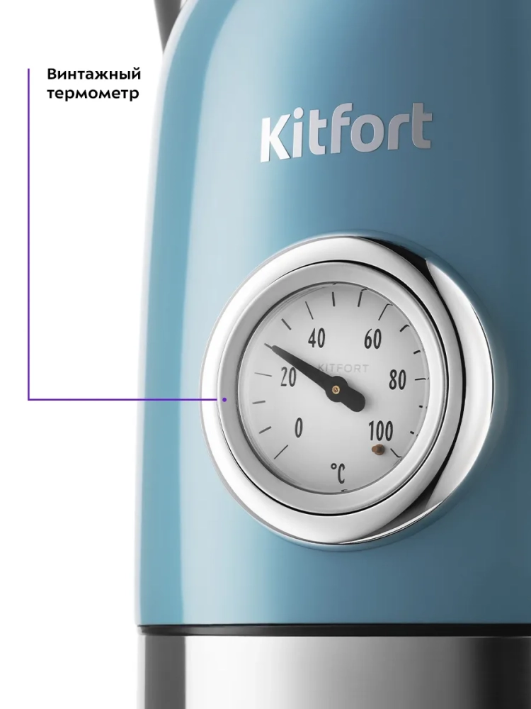 Электрический чайник Kitfort КТ-6147 предназначен для кипячения воды дома, в офисе, на даче. Корпус чайника из нержавеющей стали. Крышка выполнена из нержавеющей стали с сочетанием пластика, а подставка выполнена из пластика. Мерная шкала находится под ручкой. Ручка чайника пластиковая, не нагревается и удобно лежит в руке. Внутренняя поверхность чайника выполнена из нержавеющей стали, благодаря чему вода не соприкасается с пластиком. На крышке чайника располагается ручка для ее удобного открытия и закрытия. Для закрытия крышки просто установите крышку на место и надавите на нее до щелчка. Кнопка включения/выключения находится под ручкой, при включении чайника на ней загорается подсветка, которая является индикатором работы. Нагревательный элемент (ТЭН) у этой модели чайника скрытый и находится в донной части. Сверху он закрыт специальной металлической пластиной из нержавеющей стали, благодаря которой исключается прямой контакт ТЭНа с водой. Подставка с центральным контактом дает возможность располагать на ней чайник в любом положении, обеспечивая вращение на 360. Снизу имеется отсек для хранения шнура, в который можно смотать излишки шнура электропитания, чтобы он не мешал на столе. Чайник автоматически отключается при закипании, имеет защиту от перегрева и от включения без воды. На корпусе чайника установлен термометр, который показывает температуру воды в чайнике. Это удобно, если вы готовите напитки, для которых требуется определенная температура воды, например, зеленый чай, белый чай, кофе и т. д. Для корректной работы термометра наполняйте чайник водой выше минимального уровня, чтобы щуп термометра полностью находился в воде. При закипании воды образующийся пар попадает в паропровод, проходит по нему и затем воздействует на термодатчик, который отключает чайник. Такая конструкция позволяет чайнику отключаться при закипании воды независимо от альтитуды (высоты над уровнем моря).