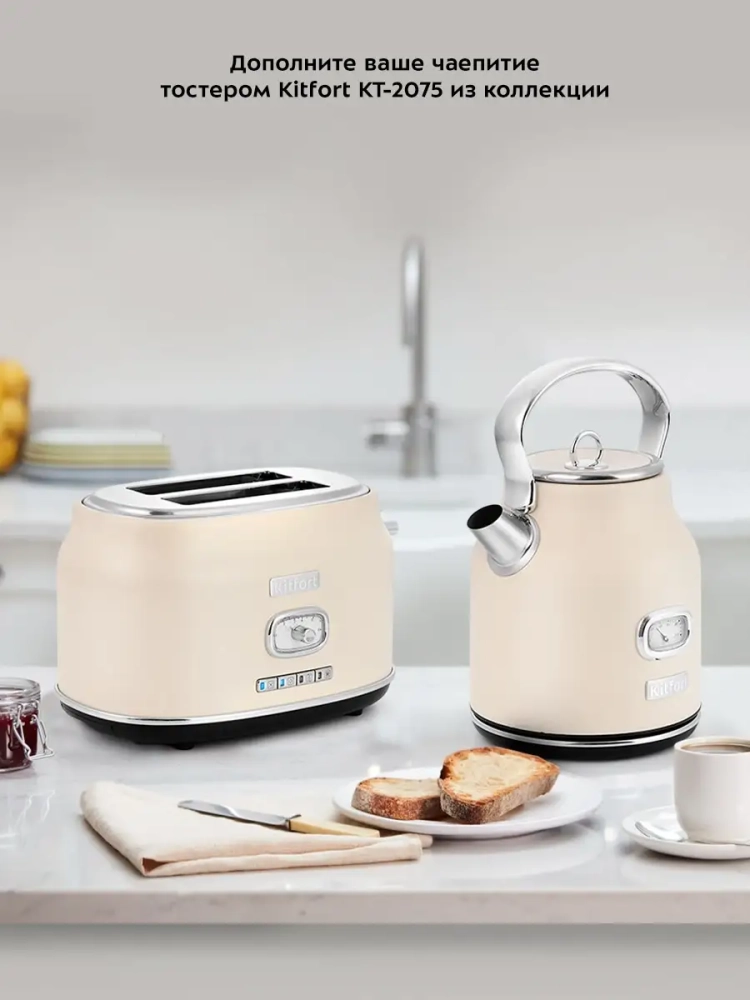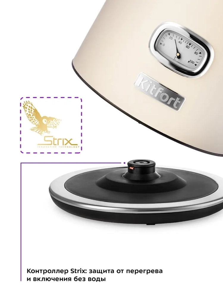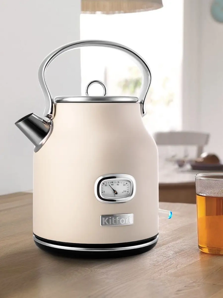 Электрический чайник Китфорт КТ-6150 — незаменимая вещь на каждой кухне, он в разы сокращает время нагрева воды по сравнению с обычной плитой. При этом не нужно следить, когда вода закипит: чайник выключится автоматически. Если во время работы чайник снять с подставки, он автоматически отключится, а кнопка включения/выключения вернется в исходное положение.