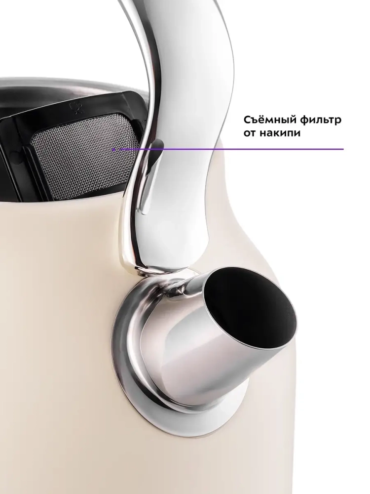 Чайник автоматически отключается при закипании, имеет защиту от перегрева и от включения без воды. В носике чайника расположен съемный фильтр от накипи. Фильтр фиксируется и плотно прилегает к внутренним стенкам чайника, так что накипь не сможет проскользнуть мимо мелкой сетки фильтра.