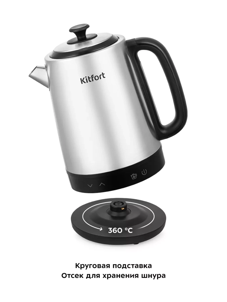 Подставка с центральным контактом дает возможность располагать на ней чайник в любом положении, обеспечивая вращение на 360°. На дне подставки имеется отсек для хранения шнура, чтобы излишки шнура не мешали на столе.
