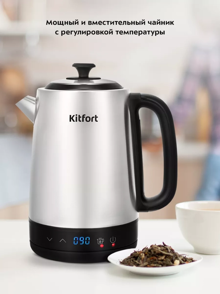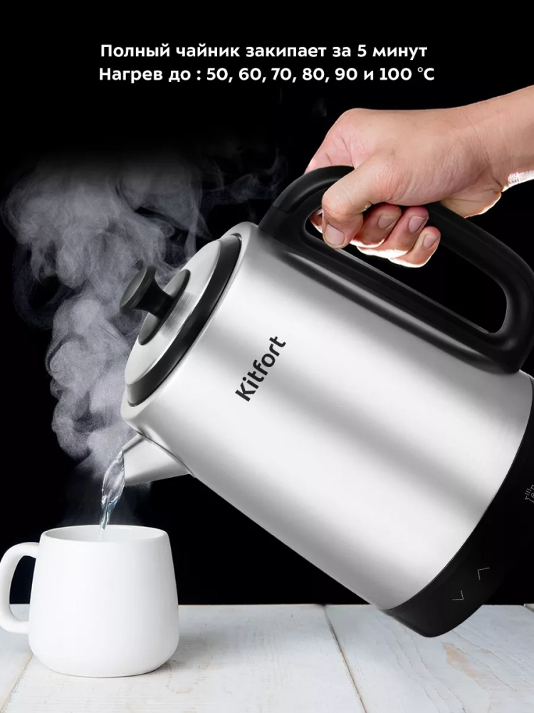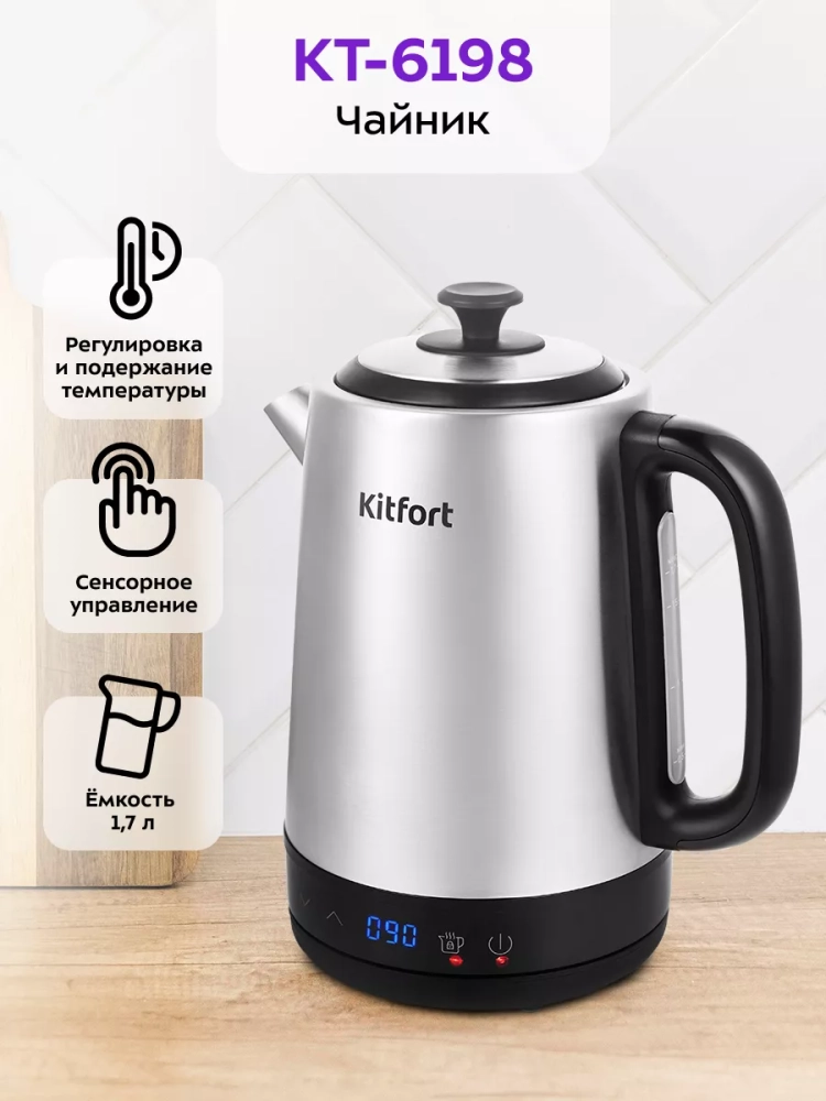 Электрический чайник с электронным терморегулятором Kitfort КТ-6198 может не только вскипятить воду, но и нагреть ее до температуры 50, 60, 70, 80 или 90 °С, что очень удобно при заваривании различных сортов чая. Чайник также оснащен поддержания температуры в течение 2 часов с выбором поддержания температуры от 50 до 90 °С с шагом 10 °С. Температура воды контролируется встроенным в дно чайника термодатчиком.