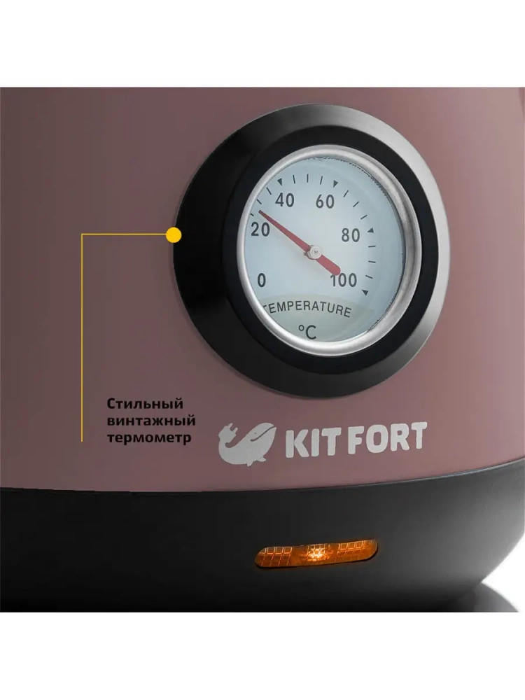 Кнопка открывания крышки расположена сверху на крышке, а кнопка включения — на ручке. При включении чайника загорается индикатор работы. Спереди на корпусе расположен аналоговый термометр, отображающий температуру воды в чайнике.