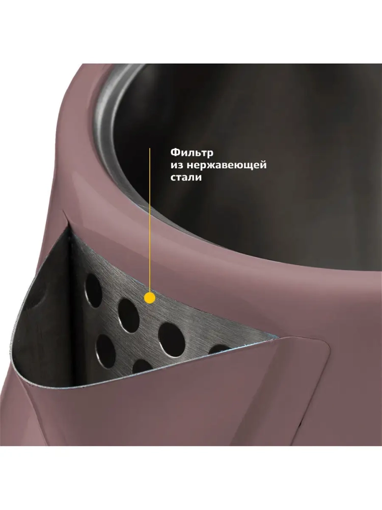 Корпус чайника выполнен из нержавеющей стали, а крышка и подставка — из пластика. Мерная шкала нанесена на корпус под рукой. Большое горлышко чайника облегчает доступ внутрь при мытье и во время удаления накипи. Ручка чайника пластиковая, не нагревается и удобно лежит в руке.
