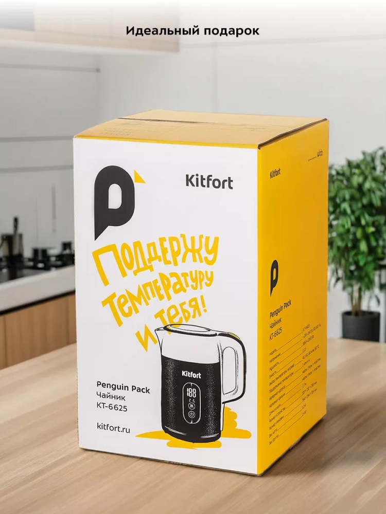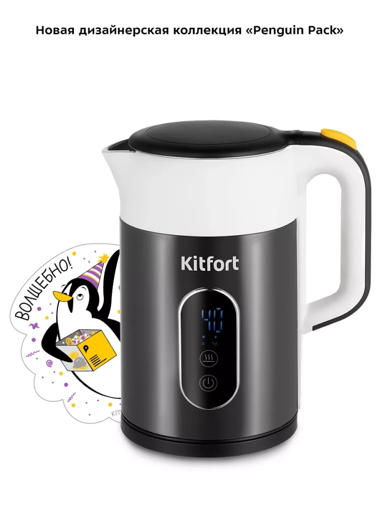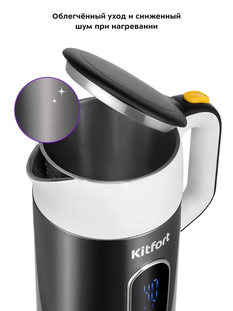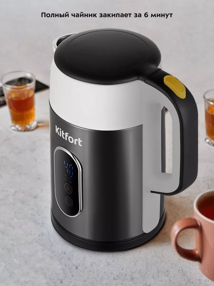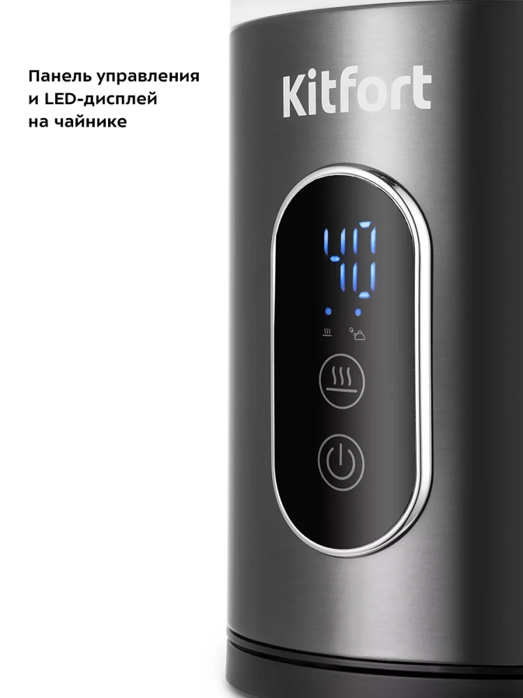 Электрический чайник с электронным терморегулятором Kitfort КТ-6625 может не только вскипятить воду, но и нагреть ее до температуры 40, 60, 80 или 90 °С, что очень удобно при заваривании различных сортов чая. Чайник также оснащен функцией поддержания температуры в течение 2 или 4 часов в зависимости от выбранной температуры. Температура воды контролируется встроенным в дно чайника термодатчиком.