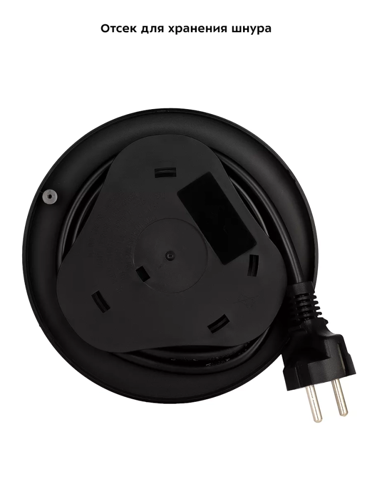 Подставка с центральным контактом дает возможность располагать на ней чайник в любом положении, обеспечивая вращение на 360°. Снизу имеется отсек для хранения шнура, в который можно смотать излишки шнура электропитания, чтобы он не мешал на столе.