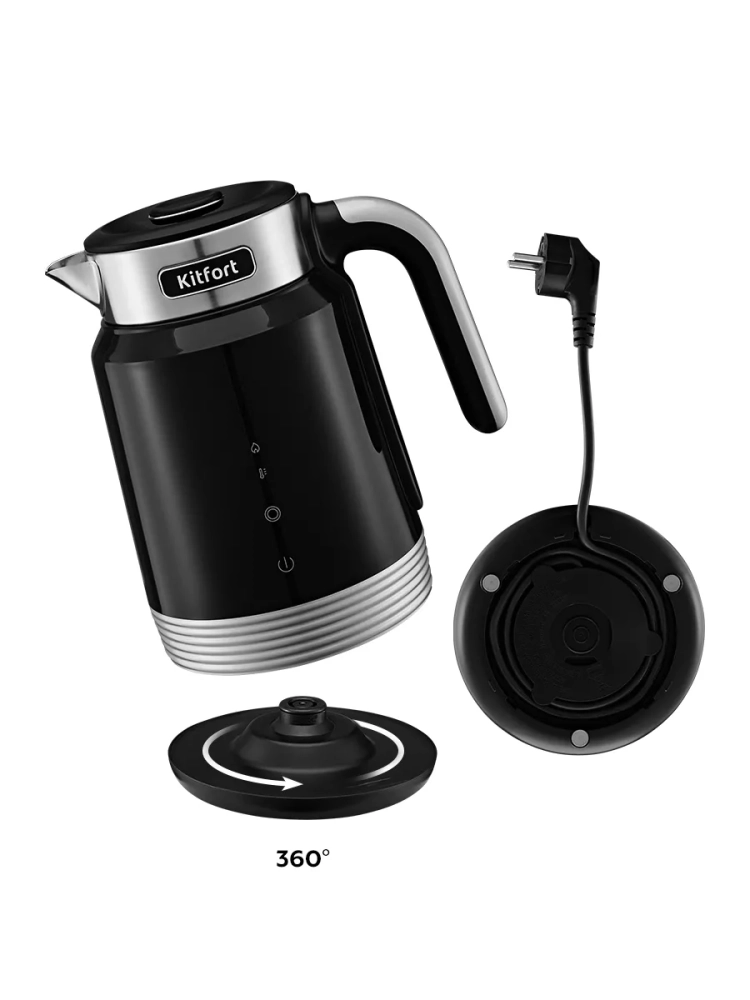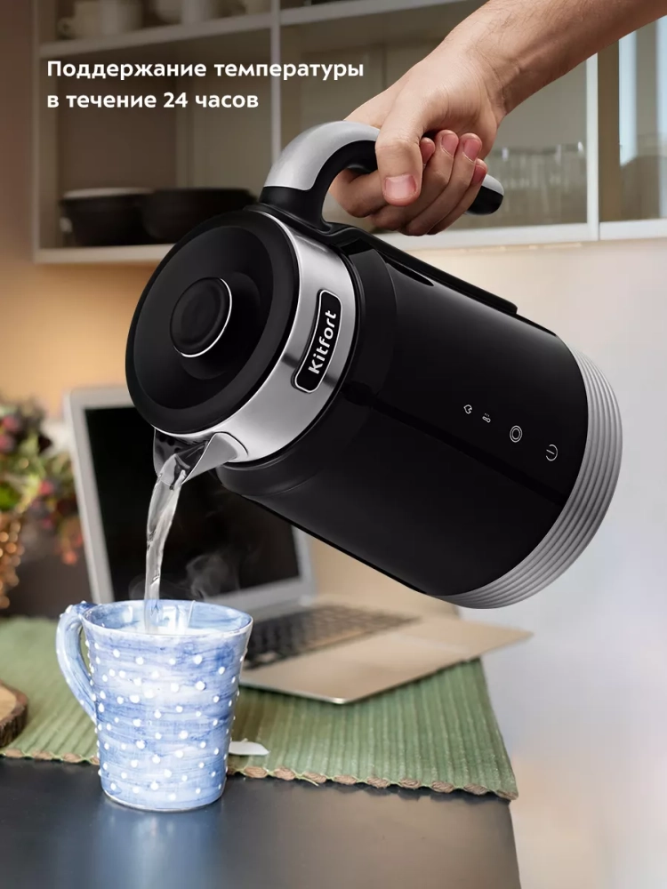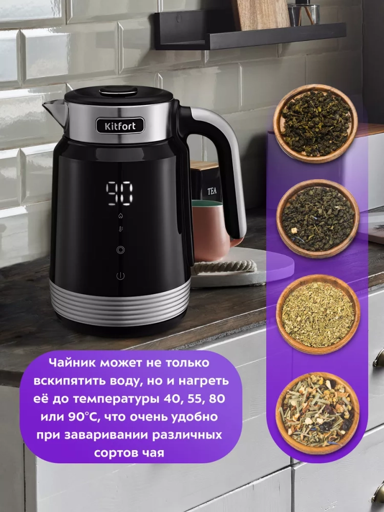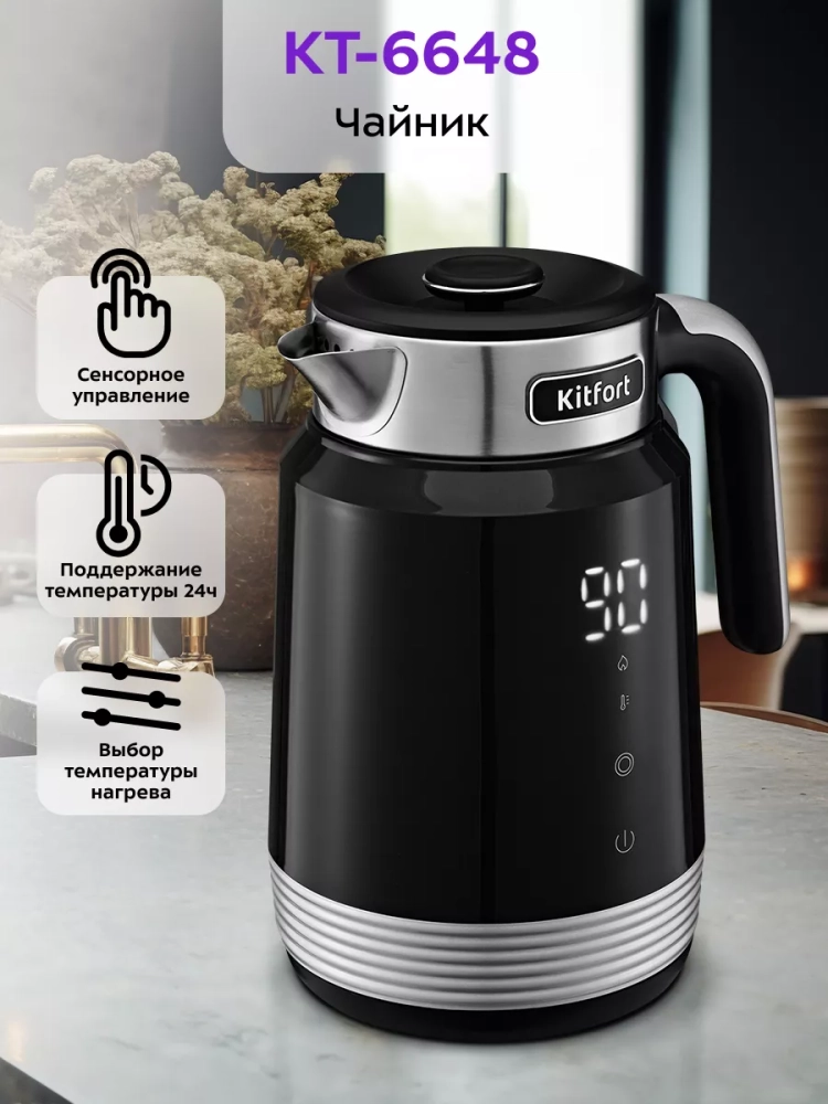Электрический чайник с электронным терморегулятором Kitfort КТ-6648 может не только вскипятить воду, но и нагреть ее до температуры 40, 55, 80 или 90 °С, что очень удобно при заваривании различных сортов чая. Чайник также оснащен функцией поддержания температуры в течение 24 часов. Температура воды контролируется встроенным в дно чайника термодатчиком.