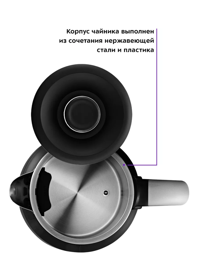 Подставка с центральным контактом дает возможность располагать на ней чайник в любом положении, обеспечивая вращение на 360°. Снизу подставки расположен отсек для хранения шнура, чтобы шнур не мешал на столе.