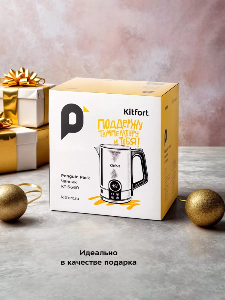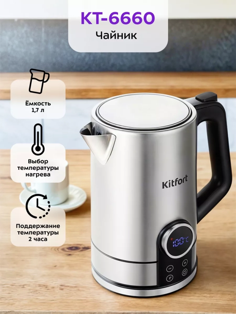 Электрический чайник с электронным терморегулятором Kitfort КТ-6660 может не только вскипятить воду, но и нагреть ее до температуры 40,50,60,70,80,90 или 95 °С, что очень удобно при заваривании различных сортов чая. Чайник также оснащен функцией поддержания температуры в течение 2 часов. Температура воды контролируется встроенным в дно чайника термодатчиком.