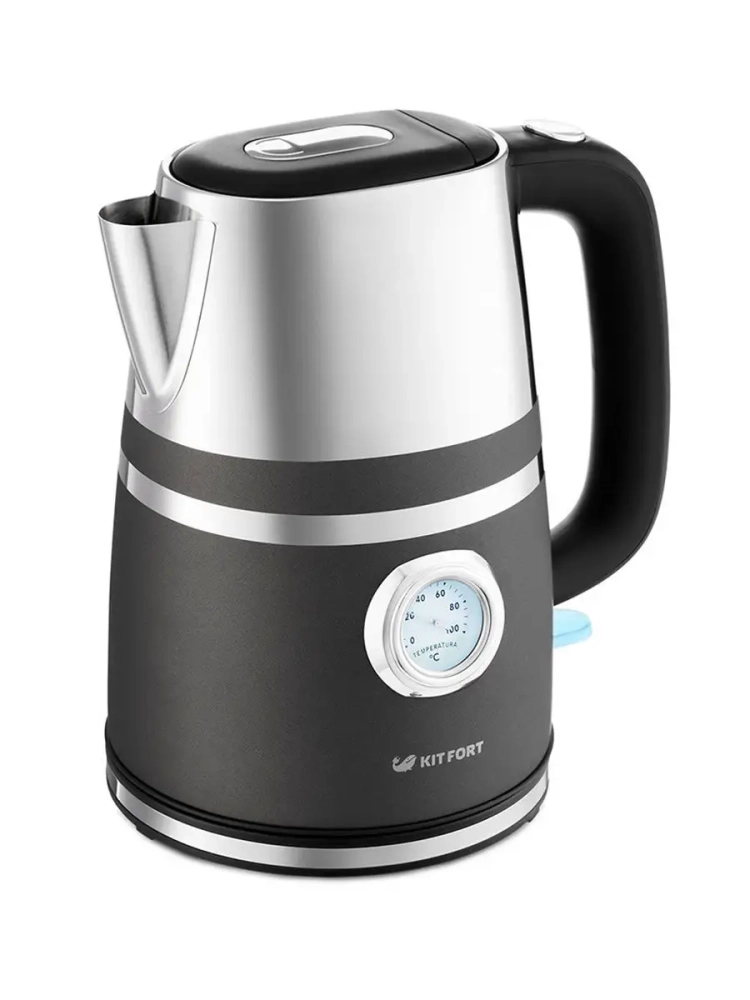 Электрический чайник Kitfort КТ-670 предназначен для кипячения воды дома, в офисах и на дачах. Мощность чайника позволяет использовать его в домах со слабой проводкой. Корпус чайника и подставка выполнен из сочетания металла и пластика, а подставка — из пластика. Мерная шкала находится на корпусе сбоку у ручки. Ручка чайника пластиковая. Она не нагревается и удобно лежит в руке. Кнопка включения/выключения расположена снизу под ручкой, а кнопка открывания крышки — на ручке. Нагревательный элемент (ТЭН) у этой модели чайника скрытый и находится в донной части. Сверху он закрыт специальной металлической пластиной из нержавеющей стали, благодаря которой исключается прямой контакт ТЭНа с водой. Такая конструкция препятствует образованию накипи, облегчает уход и значительно снижает шум при нагревании воды. На корпусе чайника установлен термометр, который показывает температуру воды в чайнике. Это удобно, если вы готовите напитки, для которых требуются определенная температура воды, например, зеленый чай, белый чай, кофе и т. д. Для корректной работы термометра наполняйте чайник водой выше минимального уровня. Подставка с центральным контактом дает возможность располагать на ней чайник в любом положении, обеспечивая вращение на 360°. Чайник Китфорт КТ-670 автоматически отключается при закипании и при снятии с подставки, имеет защиту от перегрева и от включения без воды.