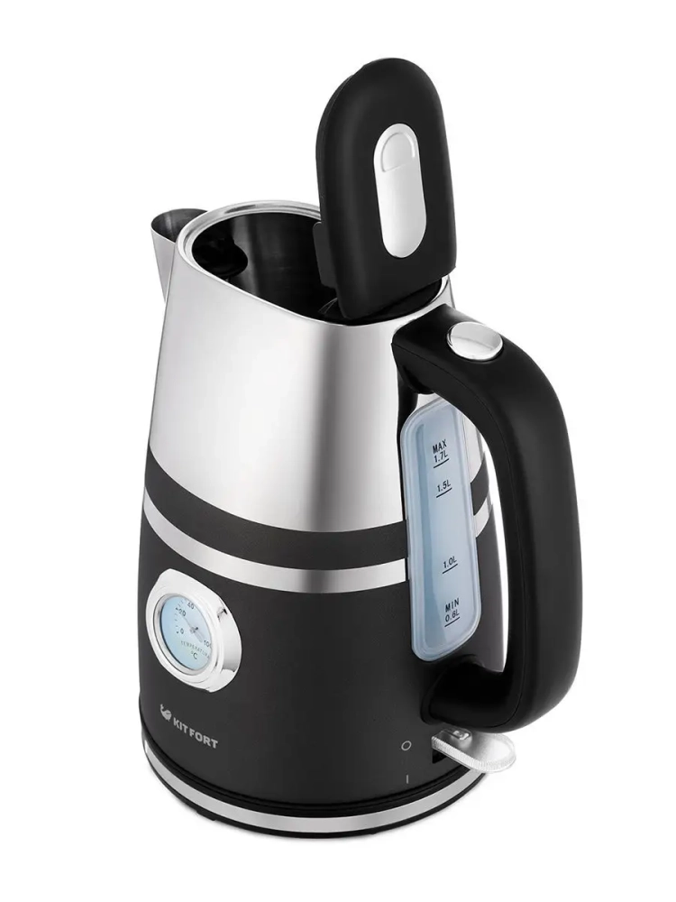 На корпусе чайника установлен термометр, который показывает температуру воды в чайнике. Это удобно, если вы готовите напитки, для которых требуются определенная температура воды, например, зеленый чай, белый чай, кофе и т. д. Для корректной работы термометра наполняйте чайник водой выше минимального уровня.
