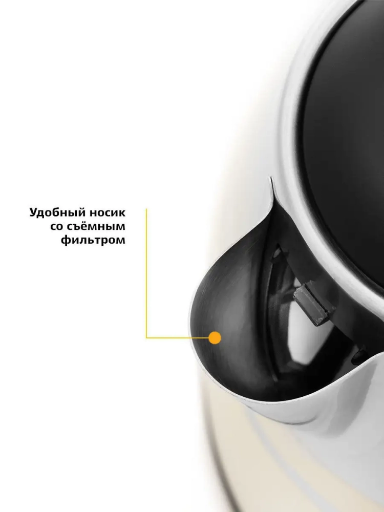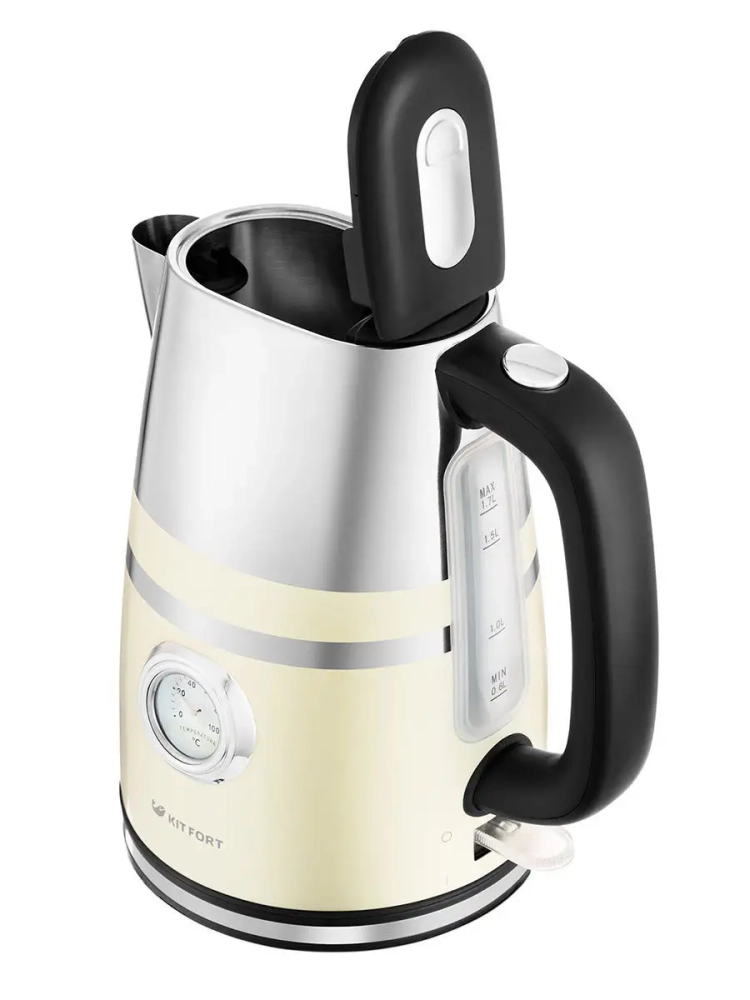 Электрический чайник Kitfort КТ-670 предназначен для кипячения воды дома, в офисах и на дачах. Мощность чайника позволяет использовать его в домах со слабой проводкой. Корпус чайника и подставка выполнен из сочетания металла и пластика, а подставка — из пластика. Мерная шкала находится на корпусе сбоку у ручки. Ручка чайника пластиковая. Она не нагревается и удобно лежит в руке. Кнопка включения/выключения расположена снизу под ручкой, а кнопка открывания крышки — на ручке. Нагревательный элемент (ТЭН) у этой модели чайника скрытый и находится в донной части. Сверху он закрыт специальной металлической пластиной из нержавеющей стали, благодаря которой исключается прямой контакт ТЭНа с водой. Такая конструкция препятствует образованию накипи, облегчает уход и значительно снижает шум при нагревании воды. На корпусе чайника установлен термометр, который показывает температуру воды в чайнике. Это удобно, если вы готовите напитки, для которых требуются определенная температура воды, например, зеленый чай, белый чай, кофе и т. д. Для корректной работы термометра наполняйте чайник водой выше минимального уровня. Подставка с центральным контактом дает возможность располагать на ней чайник в любом положении, обеспечивая вращение на 360°. Чайник Китфорт КТ-670 автоматически отключается при закипании и при снятии с подставки, имеет защиту от перегрева и от включения без воды.