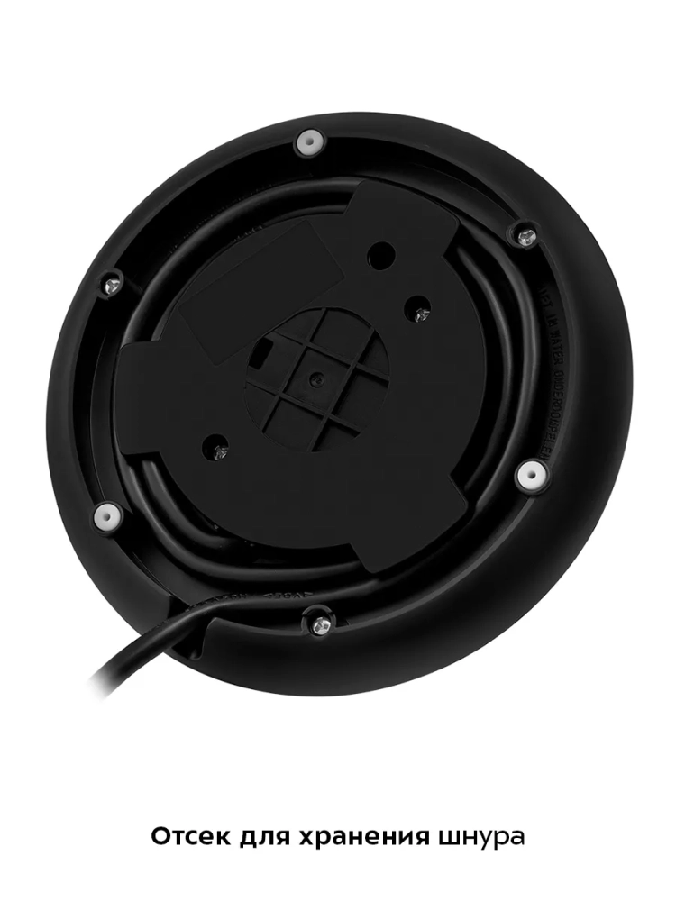 Подставка с центральным контактом дает возможность располагать на ней чайник в любом положении, обеспечивая вращение на 360°. Снизу имеется отсек для хранения шнура, в который можно смотать излишки шнура электропитания, чтобы он не мешал на столе.