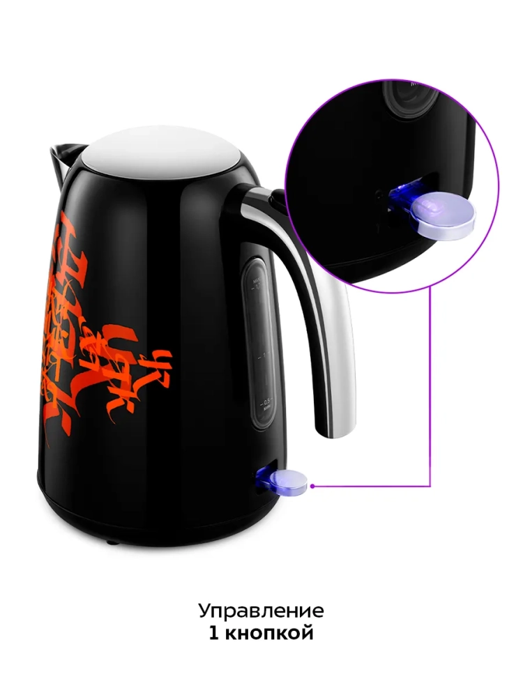 Кнопка открывания крышки расположена на ручке чайника, а переключатель — под ручкой. При включении загорается подсветка переключателя.