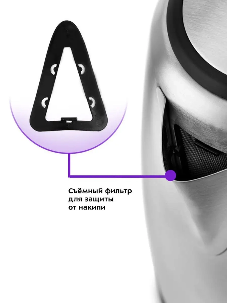 Чайник автоматически отключается при закипании, имеет защиту от перегрева и от включения без воды. В носике чайника расположен съемный фильтр от накипи.