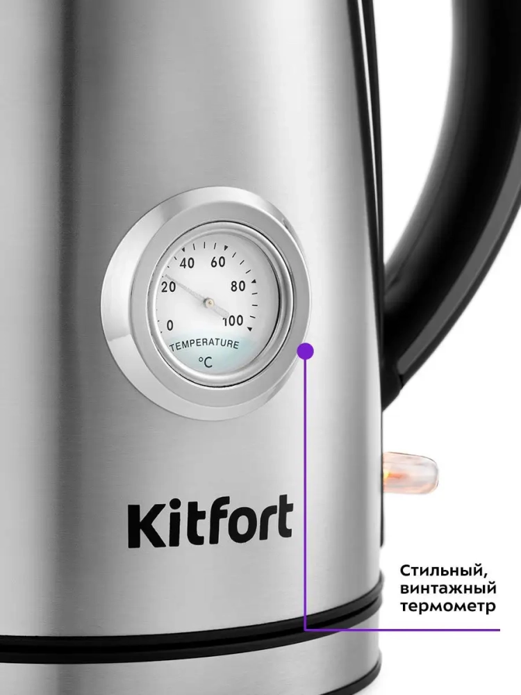 На корпусе чайника установлен термометр, который показывает температуру воды в чайнике.
