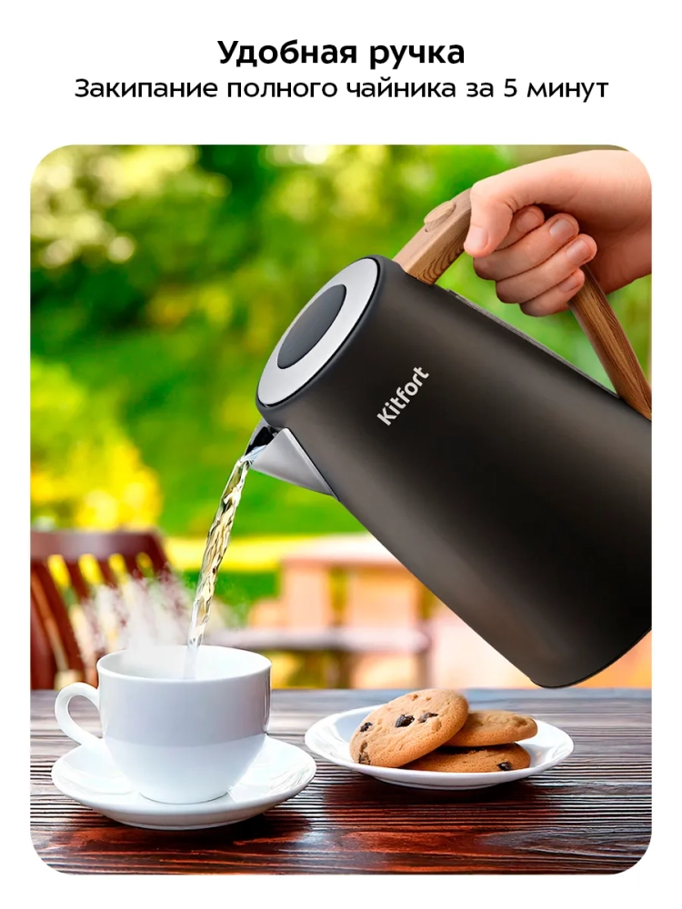 Электрические чайники Kitfort — это сочетание качества и инноваций. Кнопка включения удобно расположена на ручке, что облегчает использование. Электрочайник автоматически отключается после закипания воды, обеспечивая безопасность и экономию электроэнергии. Металлический корпус из нержавеющей стали гарантирует долговечность и простоту в уходе.