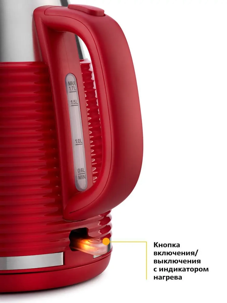 Корпус чайника двойной — внутри нержавеющая сталь, снаружи пластик. Ручка чайника пластиковая, не нагревается. Кнопка включения/выключения расположена на корпусе снизу. В кнопку включения/выключения встроен индикатор нагрева. Крышка сделана из нержавеющей стали, открывается кнопкой, которая расположена на ручке.