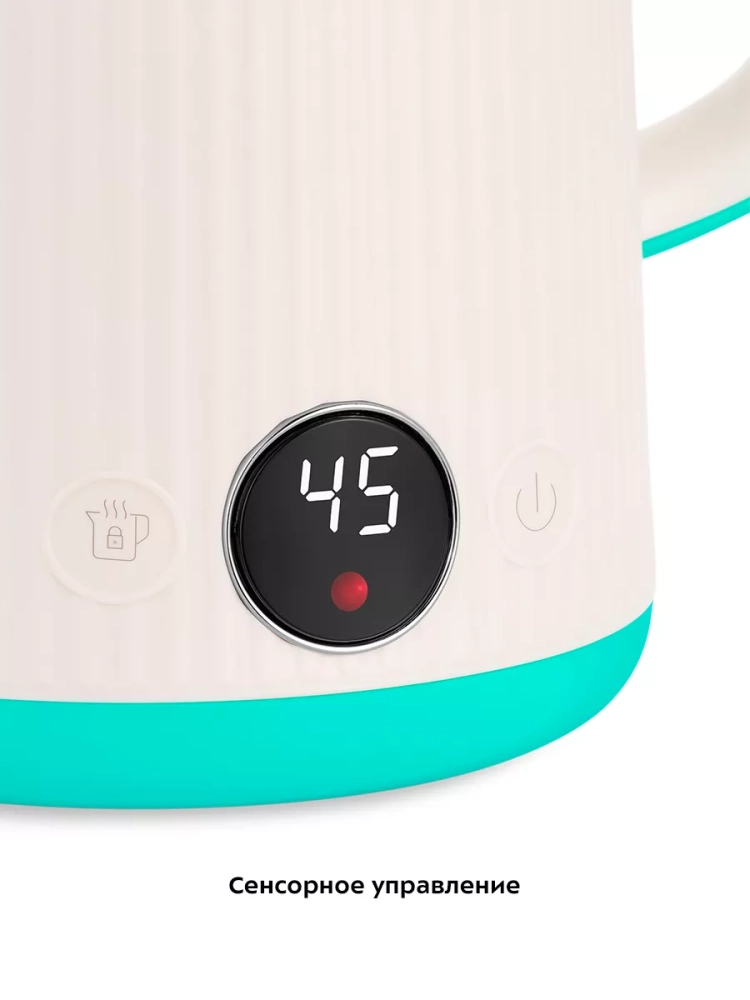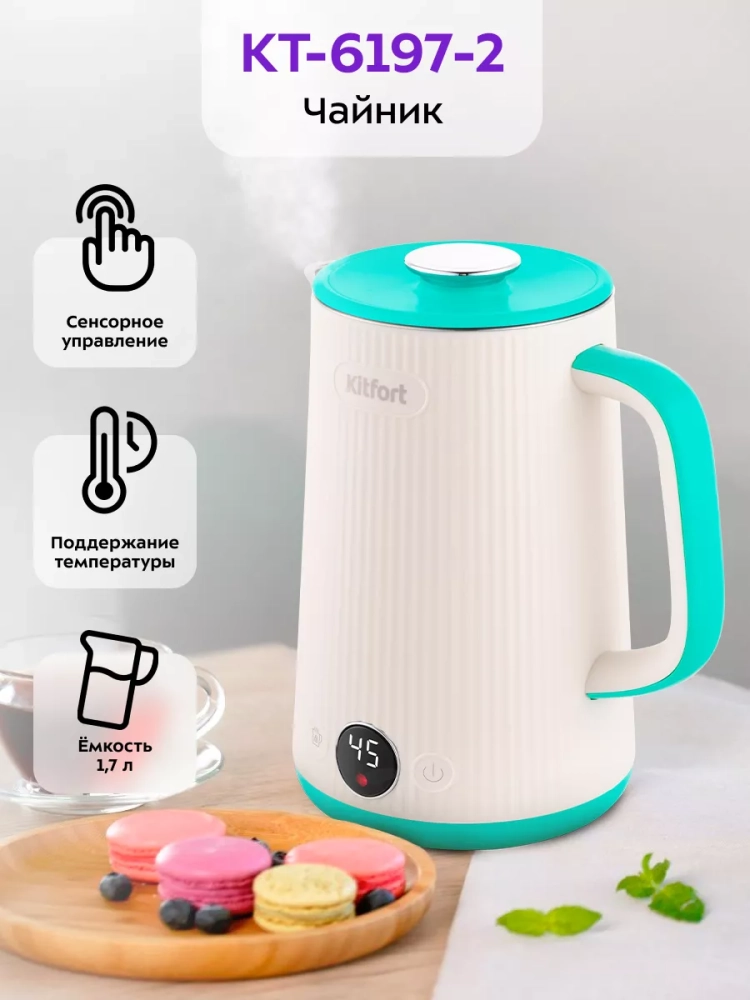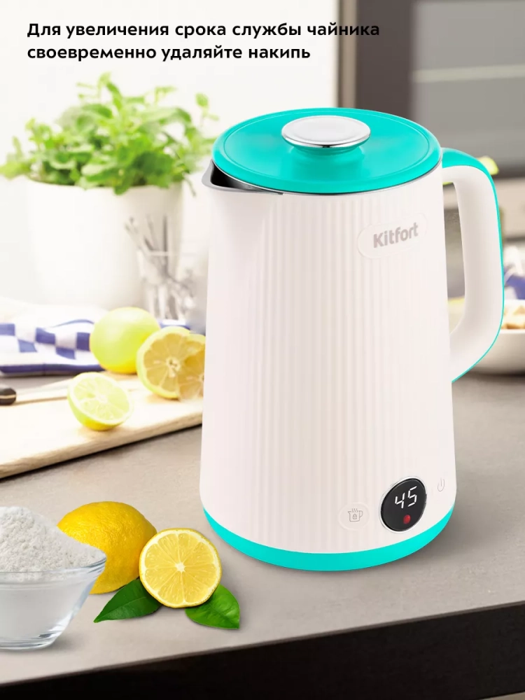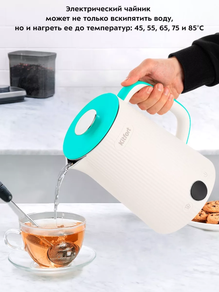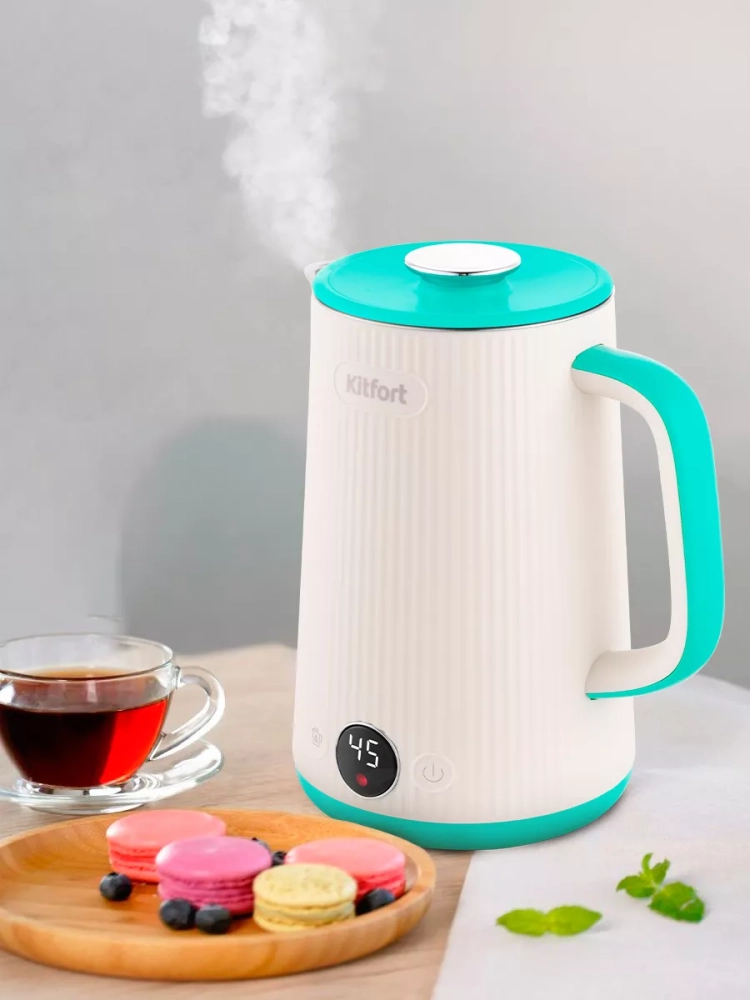 Электрический чайник с электронным терморегулятором Kitfort КТ-6197 может не только вскипятить воду, но и нагреть ее до температур: 45, 55, 65, 75 и 85 °С, что очень удобно при заваривании различных сортов чая. Температура 45 °С удобна для приготовления детского питания. Чайник также оснащен функцией поддержания температуры. Температура воды контролируется встроенным в дно чайника термодатчиком.