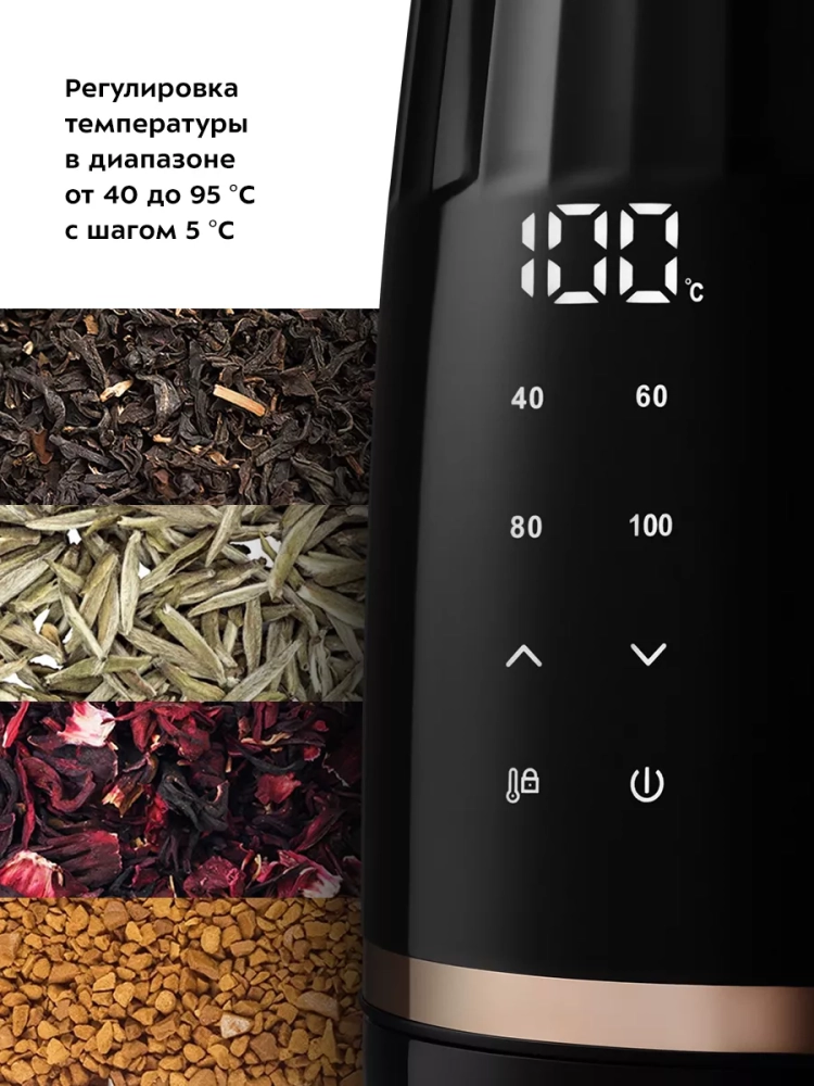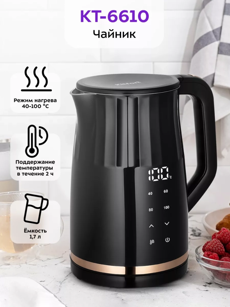 Электрический чайник с электронным терморегулятором Kitfort КТ-6610 может не только вскипятить воду, но и нагреть ее до заданной температуры. Вы можете настроить температуру нагрева в диапазоне от 40 до 95 °С с шагом 5 °С, что очень удобно при заваривании различных сортов чая. Чайник также оснащен поддержания температуры в течение 2 часов. Температура воды контролируется встроенным в дно чайника термодатчиком.