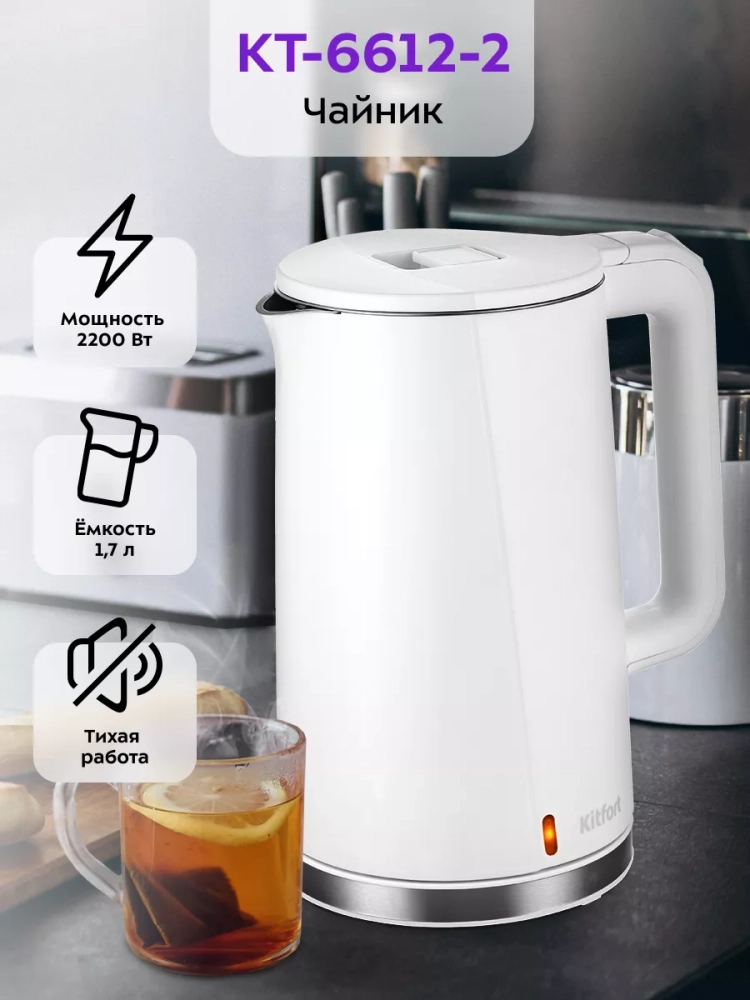 Электрический чайник Kitfort КТ-6612 предназначен для кипячения воды дома, в офисе, на даче. Полный чайник закипает примерно за 6 минут.