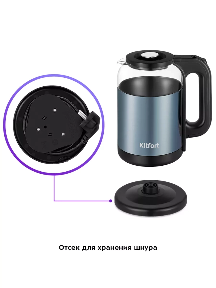 Подставка с центральным контактом дает возможность располагать на ней чайник в любом положении, обеспечивая вращение на 360°. Снизу имеется отсек для хранения шнура, в который можно смотать излишки шнура электропитания, чтобы он не мешал на столе.