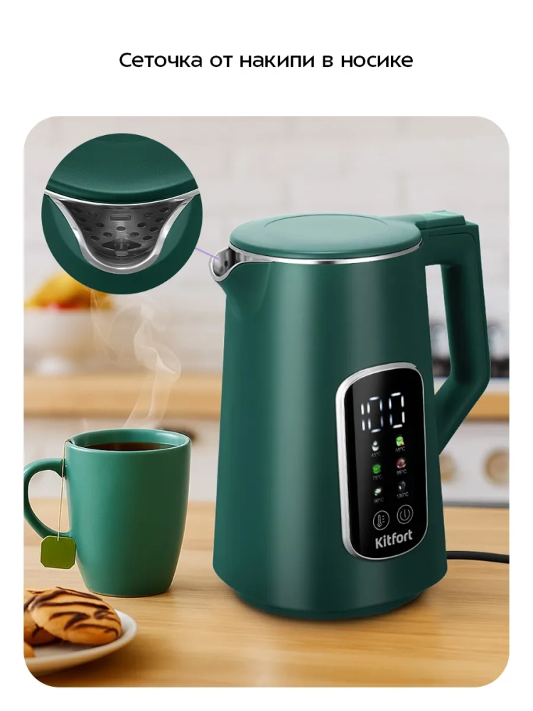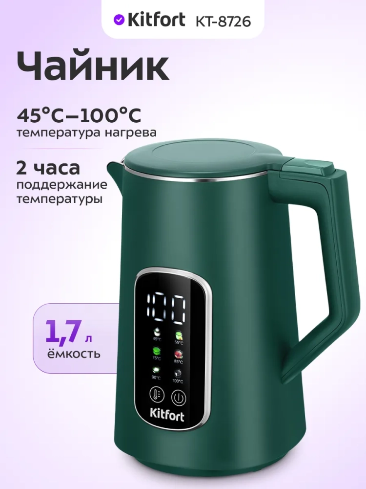 Электрический чайник Kitfort КТ-8726 предназначен для кипячения воды дома, в офисе, на даче. Прибор также может нагреть воду до температуры 45, 55, 75, 85 или 90 °С и поддерживать заданную температуру в течение 2 часов. Температура воды контролируется встроенным в дно чайника термодатчиком.