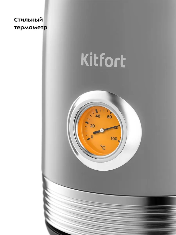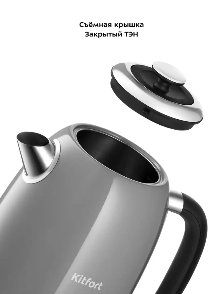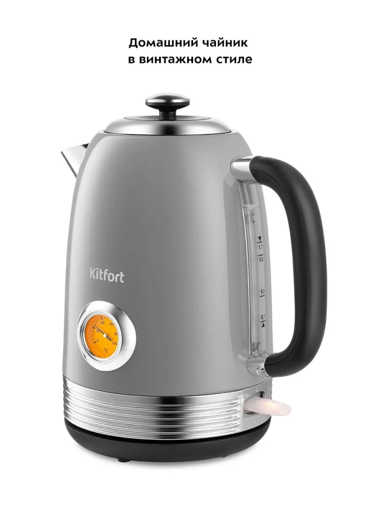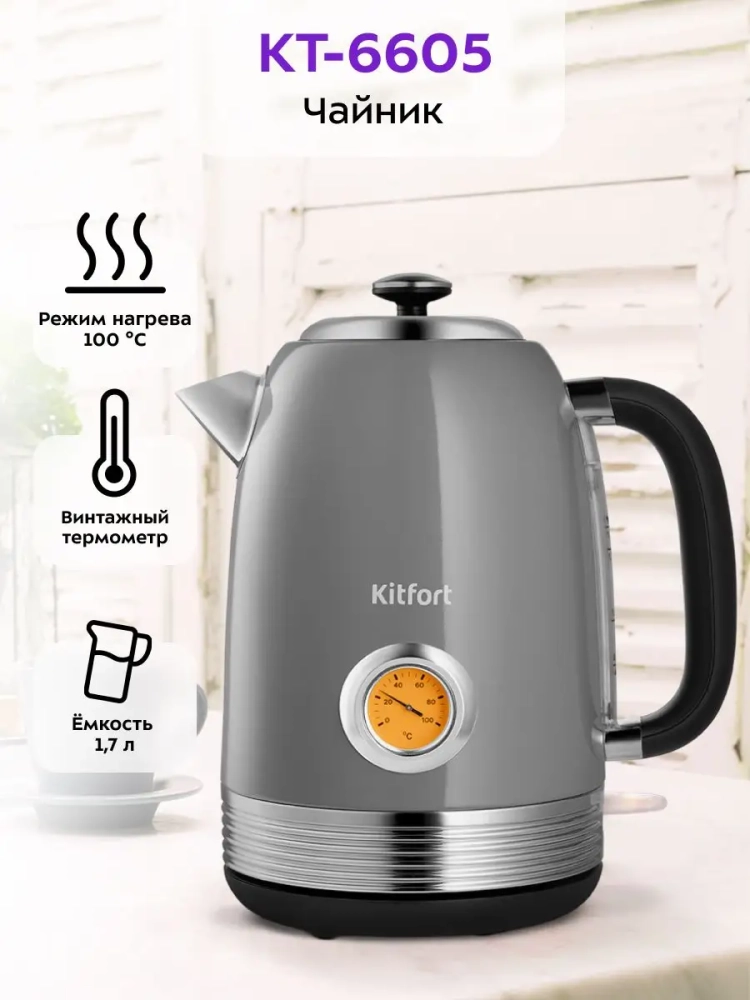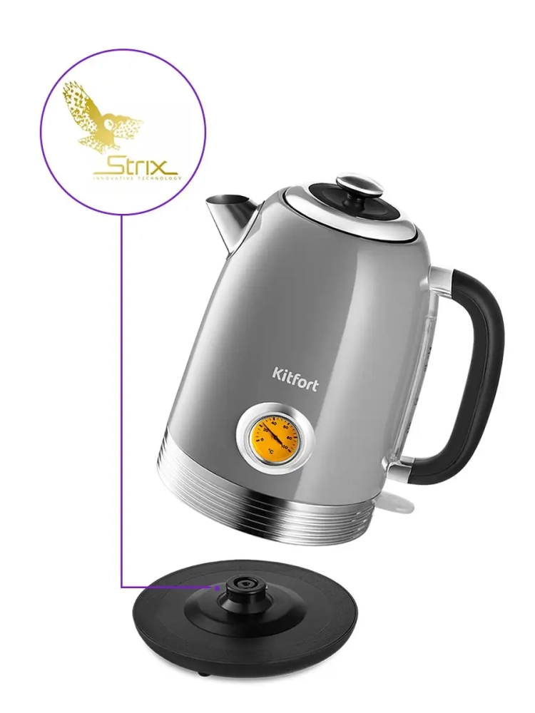 Электрический чайник Kitfort КТ-6605 предназначен для кипячения воды дома, в офисах и на дачах. Мощность чайника позволяет использовать его в домах со слабой проводкой. Корпус и крышка чайника выполнены из нержавеющей стали, а подставка — из пластика. Мерная шкала нанесена на корпус сзади. Ручка чайника пластиковая, не нагревается и удобно лежит в руке. Кнопка включения чайника расположена на корпусе снизу, на противоположной стороне от носика. При включении чайника загорается индикатор работы. На корпусе чайника расположен термометр биметаллического типа, который показывает температуру воды в чайнике. Это удобно, если вы готовите напитки, для которых требую тся определенная температура воды, например, зеленый чай, белый чай, кофе и т. д. Для корректной работы термометра наполняйте чайник водой выше минимального уровня. Нагревательный элемент (нагреватель ТЭН) у этой модели чайника скрытый и находится в донной части. Сверху бытовой электрочайник закрыт специальной металлической пластиной из нержавеющей стали, благодаря которой исключается прямой контакт ТЭНа с водой. Такая конструкция препятствует образованию накипи, облегчает уход и значительно снижает шум при нагревании воды. Подставка с центральным контактом дает возможность располагать на ней чайник в любом положении, обеспечивая вращение на 360°. Снизу имеется отсек для хранения шнура, в который можно смотать излишки шнура электропитания, чтобы он не мешал на столе. В носике чайника расположен съемный фильтр от накипи из нейлона, который задерживает частички накипи и предотвращает попадание их в чашку. Полный чайник 1,7 литра закипит за 7 минут. При закипании чайник автоматически отключится. Прибор имеет защиту от перегрева и от включения без воды: при включении без воды чайник нагревается и отключается (срабатывает защита от перегрева).