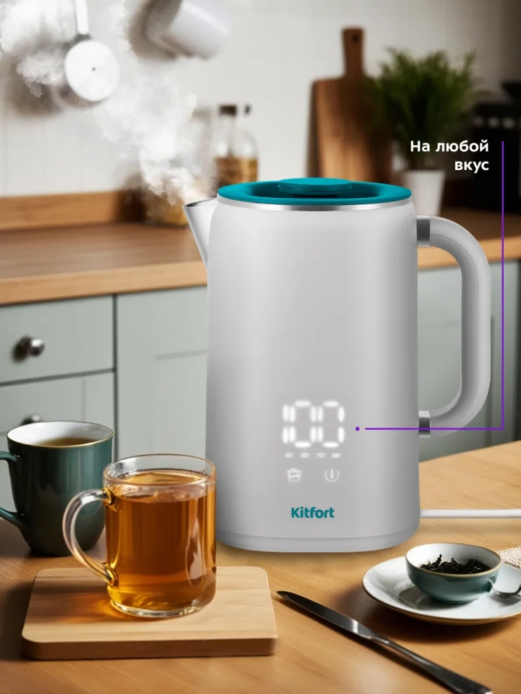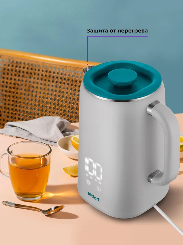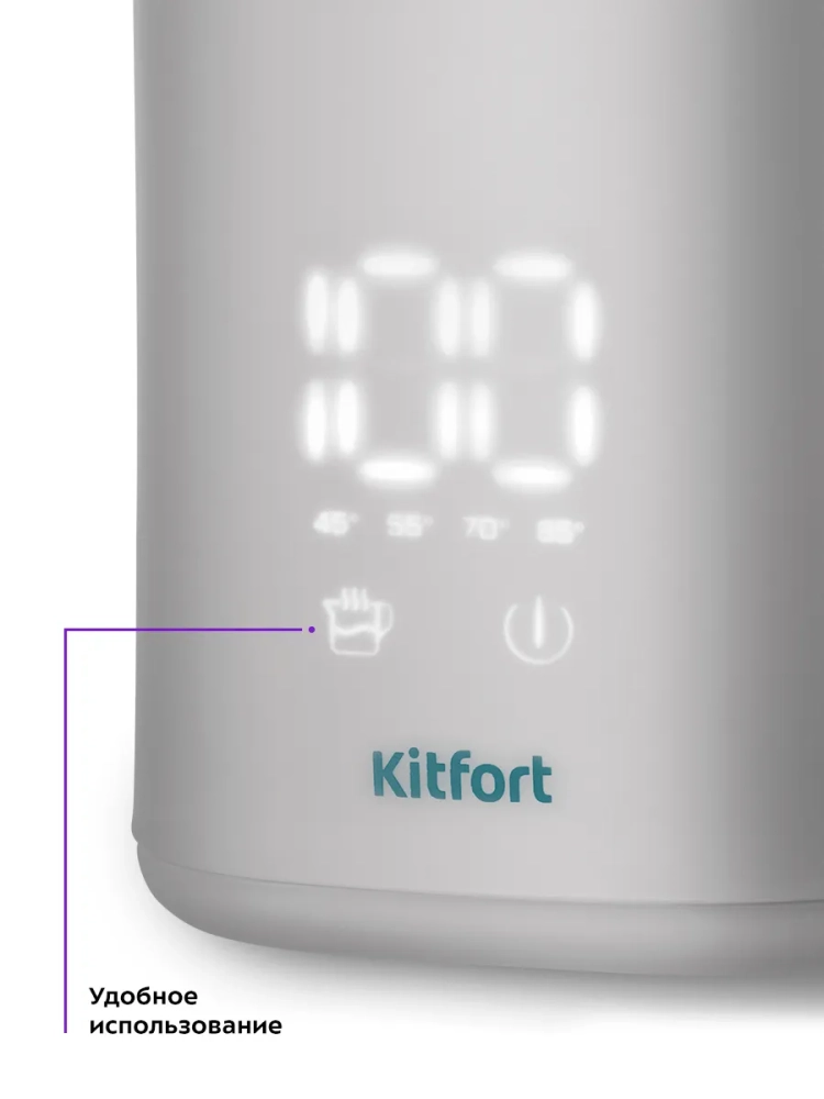 Электрический чайник Kitfort КТ-6687 может не только вскипятить воду, но и нагреть ее до температур: 45, 55, 70 и 85 °С, что очень удобно при заваривании различных сортов чая. Температура 45 °С удобна для приготовления детского питания. Чайник также оснащен функцией поддержания температуры. Температура воды контролируется встроенным в дно чайника термодатчиком. У корпуса чайника двойные стенки: внутренняя часть выполнена из нержавеющей стали, а внешняя — из пластика. Мерная шкала нанесена на внутреннюю часть корпуса.