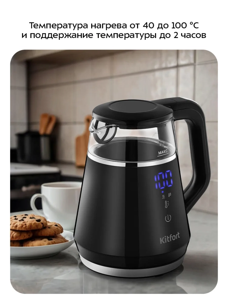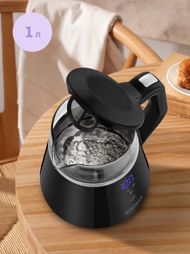 Электрический чайник Kitfort КТ-6696 с терморегулятором — это идеальное бытовое решение для любителей чая. Этот термочайник не только вскипятит воду, но и нагреет её до 40, 70, 80 или 90 °С. Это особенно удобно для заваривания различных сортов чая. Чайник оснащён функцией поддержания температуры в течение двух часов благодаря встроенному термодатчику. Корпус чайника выполнен из двойных стенок: внутренняя часть из стекла, а внешняя — из пластика. На корпусе расположена панель управления и дисплей, где отображается текущая температура воды и заданная температура нагрева. Постоянное отображение температуры на дисплее делает использование прибора ещё более удобным. Нагревательный элемент (нагреватель ТЭН) скрыт в донной части устройства и защищён металлической пластиной из нержавеющей стали. Такая конструкция предотвращает образование накипи и снижает шум при нагревании воды. Подставка с центральным контактом позволяет вращать чайник на 360°, что упрощает его использование. Чайник автоматически отключается при закипании воды и имеет защиту от перегрева и включения без воды, обеспечивая безопасность использования и поддержания температурного режима. Работает от сети напряжением ~220–240 В с мощностью от 900 до 1100 Вт. Емкость этого электрического чайника составляет один литр, что идеально подходит для небольшой семьи или офиса. Материалы корпуса — стекло плюс пластик; крышка также выполнена из пластика.