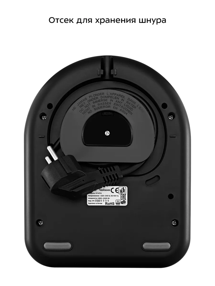 Подставка с центральным контактом дает возможность размещать на ней чайник в любом положении, обеспечивая вращение на 360°. Снизу подставки расположен отсек для хранения шнура, чтобы шнур не мешал на столе.