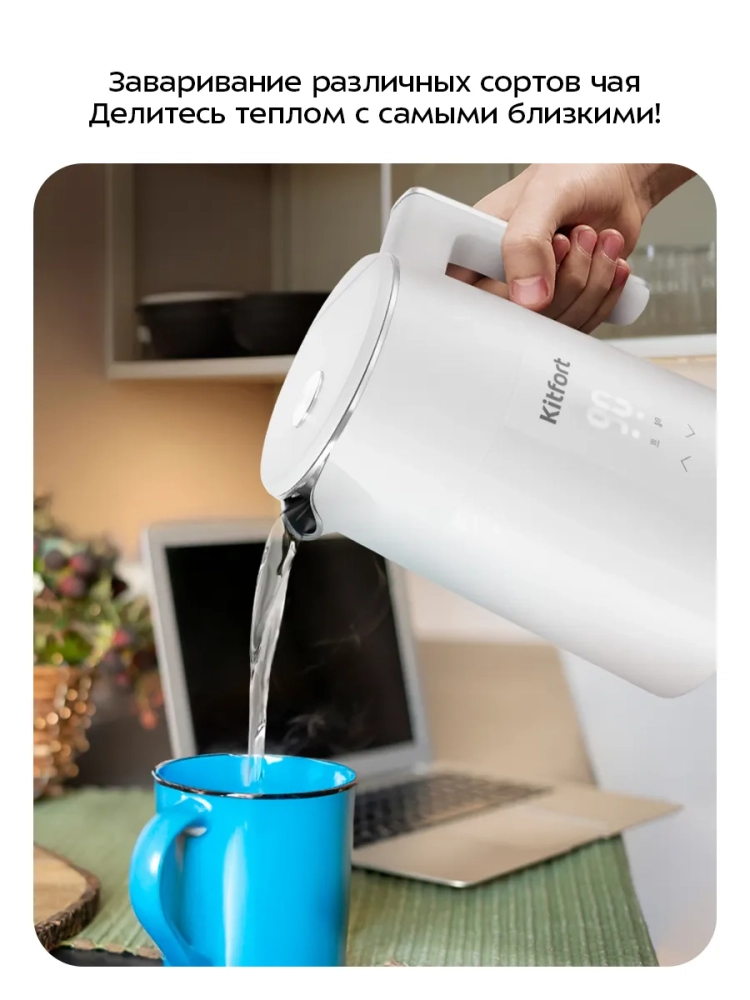 Электрочайники Kitfort отличаются низким уровнем шума, что делает их использование комфортным в любое время суток. Электрическая техника Kitfort — это сочетание инноваций и надежности. Электрический чайник КТ-6715 оснащен удобной электронной кнопкой для выбора режима, что упрощает его использование. Емкость чайника составляет 1,5 литра, что идеально подходит для семейного использования.