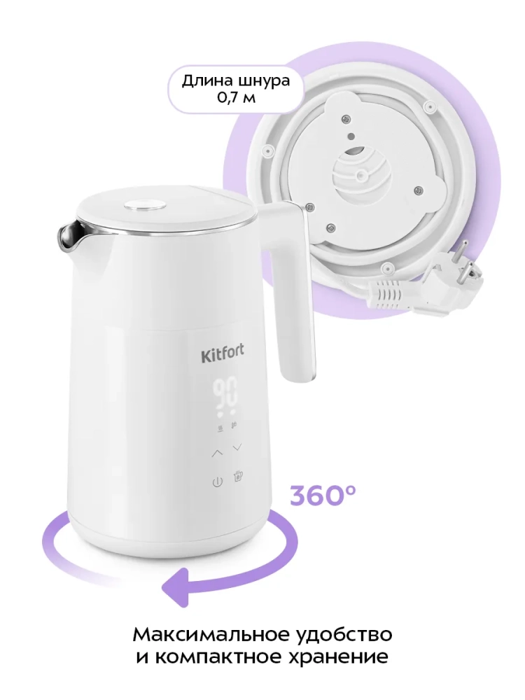 Белый цвет корпуса придает чайнику элегантный вид, который гармонично впишется в интерьер любой кухни. Электрический чайник Kitfort — это не просто техника, это стиль жизни. Он заменит газплиту и станет незаменимым помощником в вашем доме. Электрочайники Kitfort — это выбор тех, кто ценит качество и удобство.