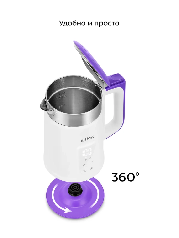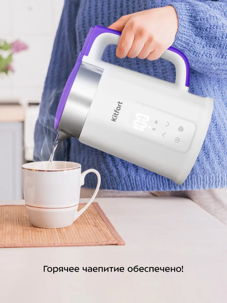 Электрический чайник с электронным терморегулятором Kitfort КТ-6717 может не только вскипятить воду, но и нагреть ее до температуры в диапазоне от 40 до 90 °С с шагом 10 °С, что очень удобно при заваривании различных сортов чая. Чайник также оснащен функцией поддержания температуры в течение 2 часов. Температура воды контролируется встроенным в дно чайника термодатчиком.