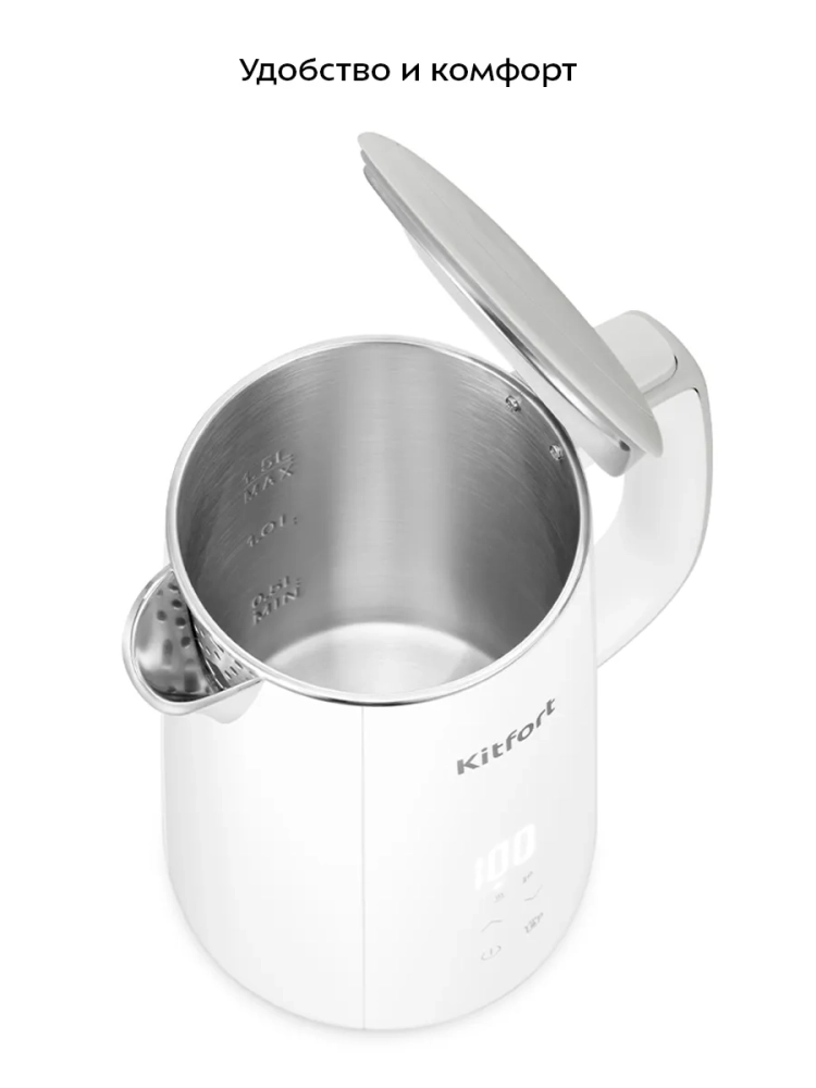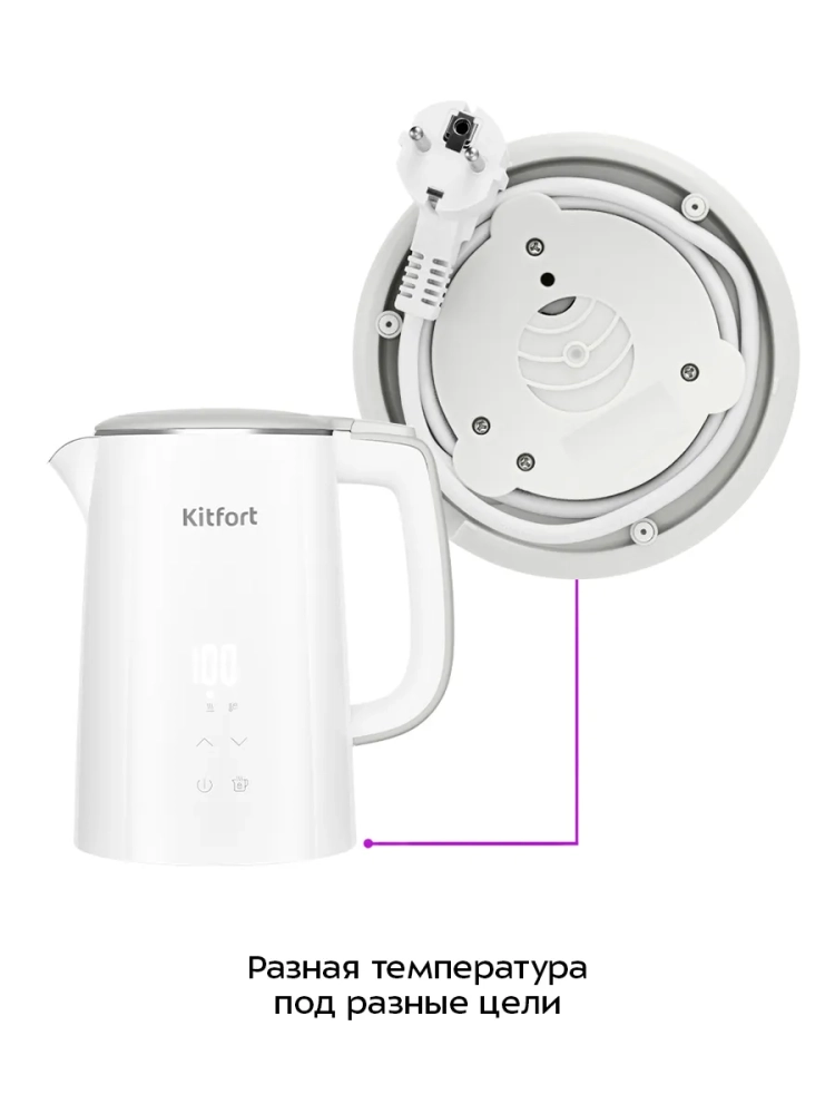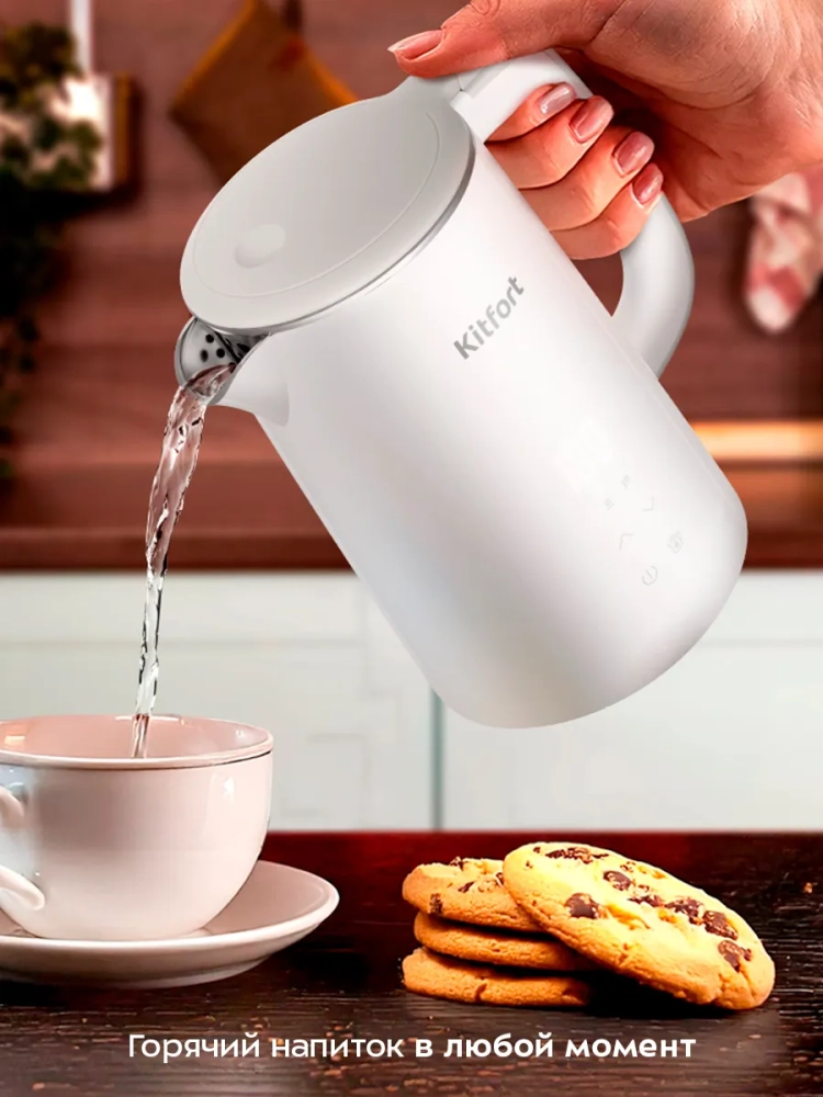 Электрический чайник с электронным терморегулятором Kitfort КТ-6718 может не только вскипятить воду, но и нагреть ее до температуры в диапазоне от 40 до 90 °С с шагом 10 °С, что очень удобно при заваривании различных сортов чая. Чайник также оснащен функцией поддержания температуры в течение 2 часов. Температура воды контролируется встроенным в дно чайника термодатчиком.