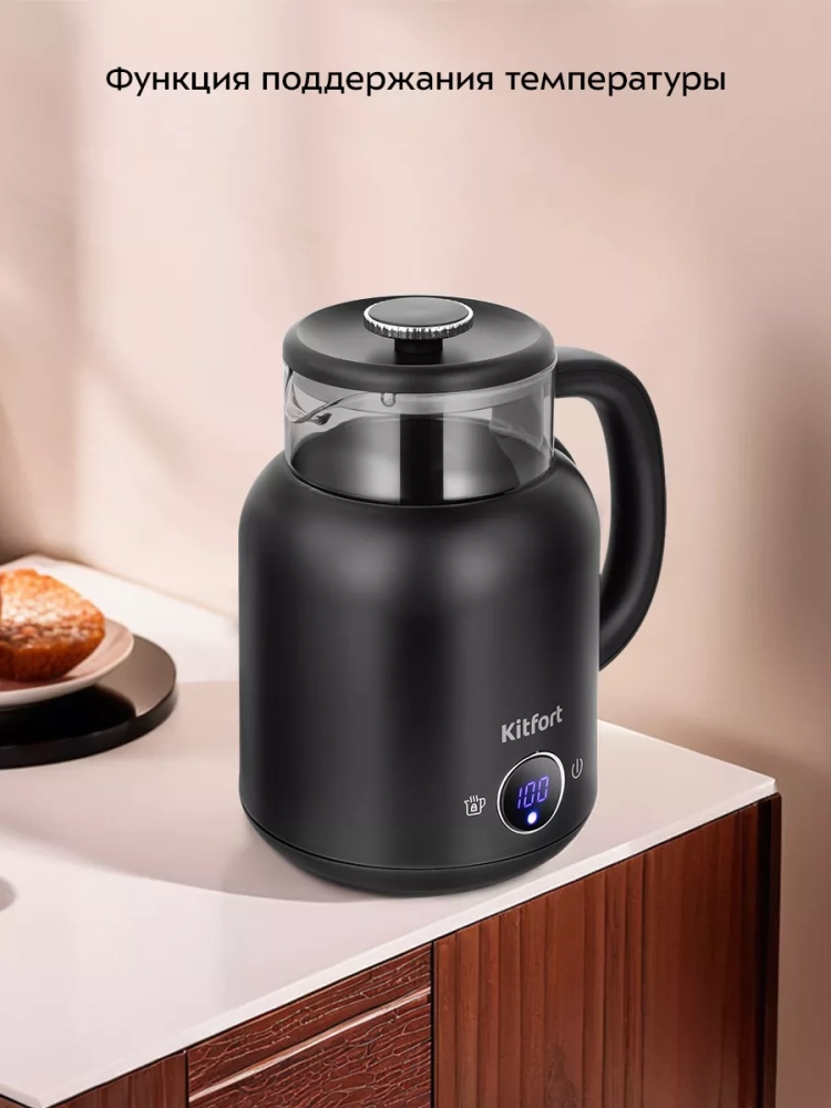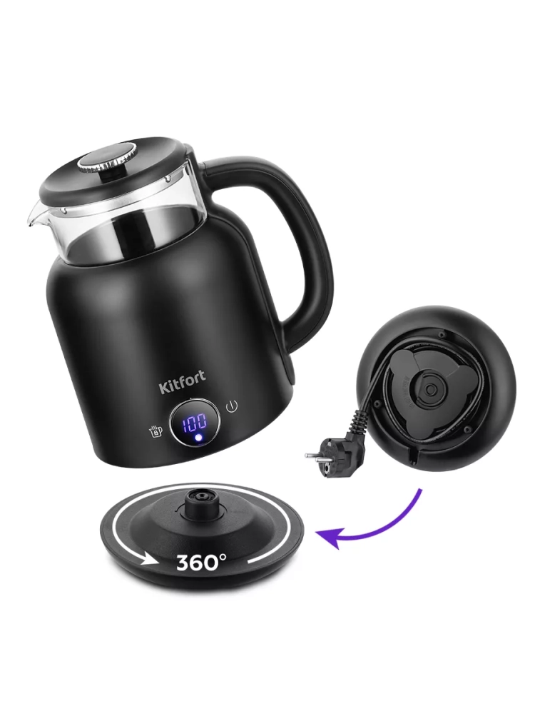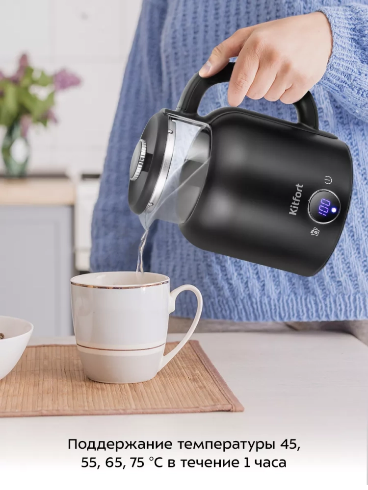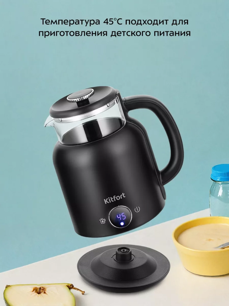 Электрический чайник с электронным терморегулятором Kitfort КТ-6725 может не только вскипятить воду, но и нагреть ее до температур: 45, 55, 65 и 75 °С, что очень удобно при заваривании различных сортов чая. Температура 45 °С подходит для приготовления детского питания. Чайник также оснащен функцией поддержания температуры. Температура воды контролируется встроенным в дно чайника термодатчиком.