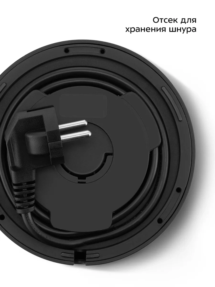Подставка с центральным контактом дает возможность располагать на ней чайник в любом положении, обеспечивая вращение на 360°. Снизу имеется отсек для хранения шнура, в который можно смотать излишки шнура электропитания, чтобы он не мешал на столе.