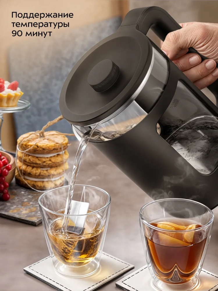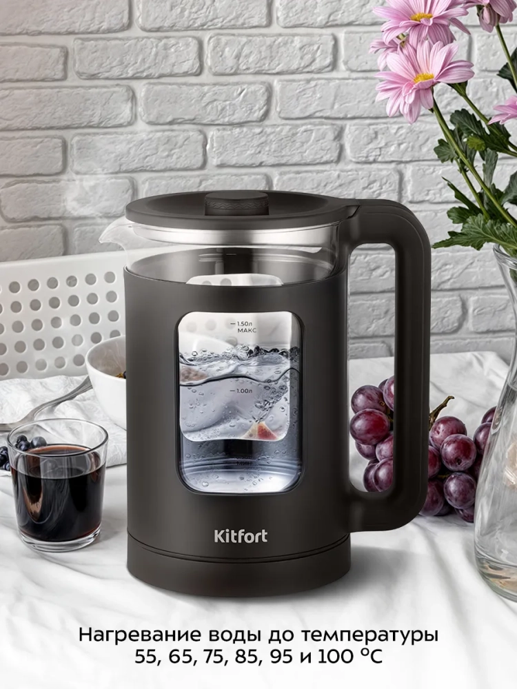 Электрический чайник Kitfort КТ-6782 предназначен для кипячения воды дома, в офисе, на даче. Прибор также может нагреть воду до температуры 55, 65, 75, 85 или 95 °С и поддерживать заданную температуру в течение 90 минут. Температура воды контролируется встроенным в дно чайника термодатчиком.