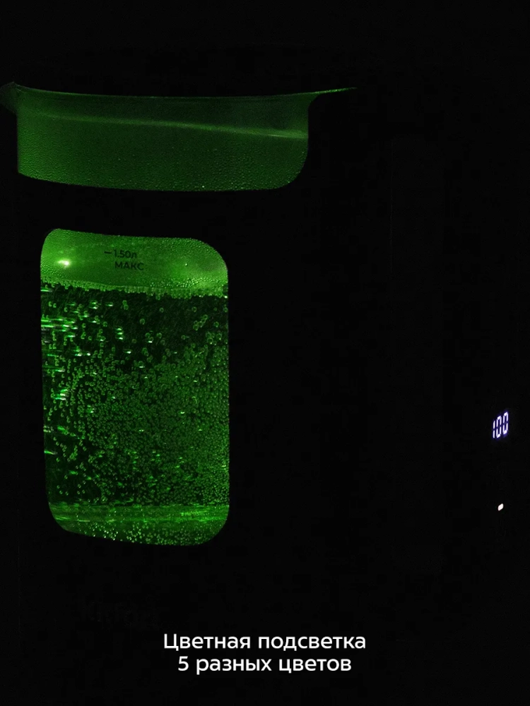 Панель управления расположена на ручке чайника. При включении загорается подсветка, которая является индикатором работы и подсвечивает воду в приборе. Подсветка горит пятью разными цветами в зависимости от температуры воды.