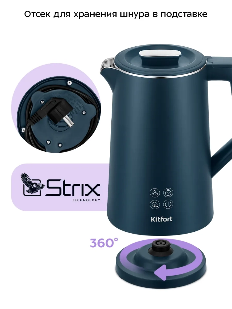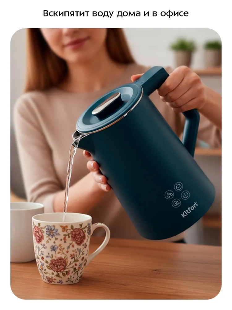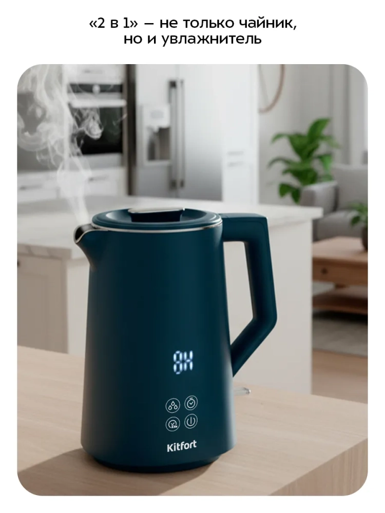 Электрический чайник-увлажнитель Kitfort КТ-8728 — это прибор, совмещающий в себе функции двух устройств: чайника и увлажнителя воздуха. Чайник-увлажнитель поможет не только вскипятить воду дома, в офисе или на даче, но и создаст комфортный уровень влажности в помещениях, площадь которых не превышает 15 м2. Устройство увлажняет воздух паром, который образуется при кипячении воды.