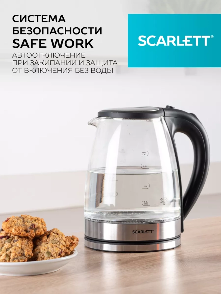 Система безопасности Safe Work – автоматическое отключение при закипании воды, защита от включения при отсутствии воды в чайнике.