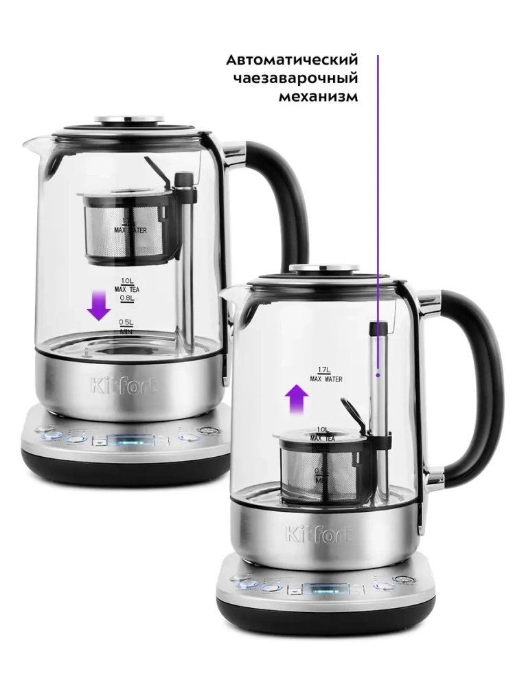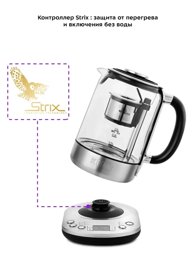 Электрический чайник с электронным терморегулятором Kitfort КТ-6116 может не только вскипятить воду, но и нагреть ее до температур: 40, 70, 80, 85, 90, 95 и 100 °С, что очень удобно при заваривании различных сортов чая. Температура 40 °С удобна для приготовления детского питания. Чайник также оснащен функцией поддержания температуры.