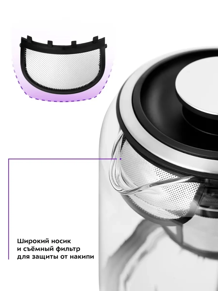 Корпус чайника выполнен из стекла, а крышка и подставка — из сочетания пластмассы и нержавеющей стали. Мерная шкала нанесена на прозрачную часть корпуса. Съемная крышка и большое горлышко чайника облегчают доступ внутрь при его мойке и во время удаления накипи. Ручка чайника пластиковая, не нагревается и удобно лежит в руке.