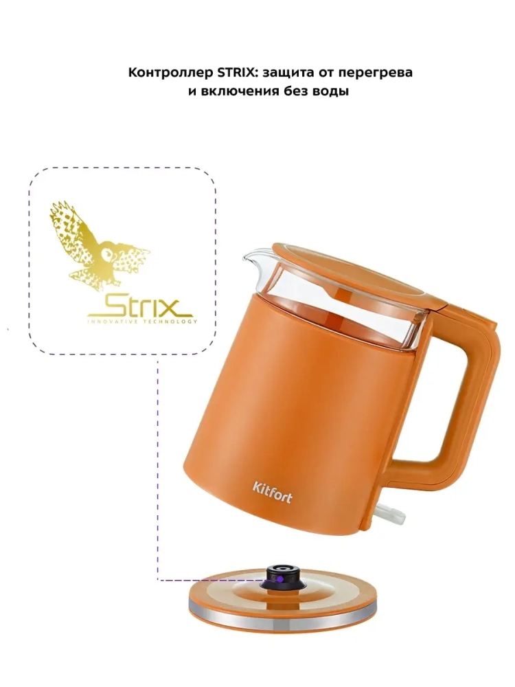 Электрический чайник Китфорт КТ-6124 — незаменимая вещь на каждой кухне, он в разы сокращает время нагрева воды по сравнению с обычной плитой. При этом не нужно следить, когда вода закипит: чайник выключится автоматически. Если во время работы чайник снять с подставки, он автоматически отключится, а кнопка включения/выключения вернется в исходное положение.