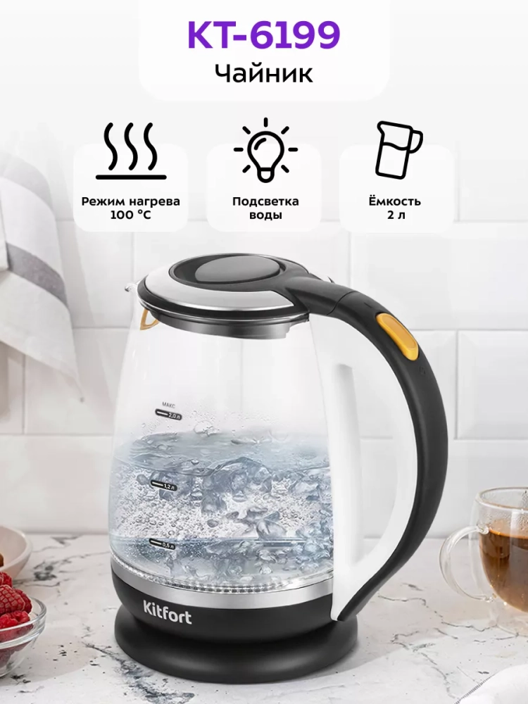 Электрический чайник Kitfort КТ-6199 предназначен для кипячения воды дома, в офисе, на даче. Мощность чайника позволяет использовать его в домах со слабой проводкой.