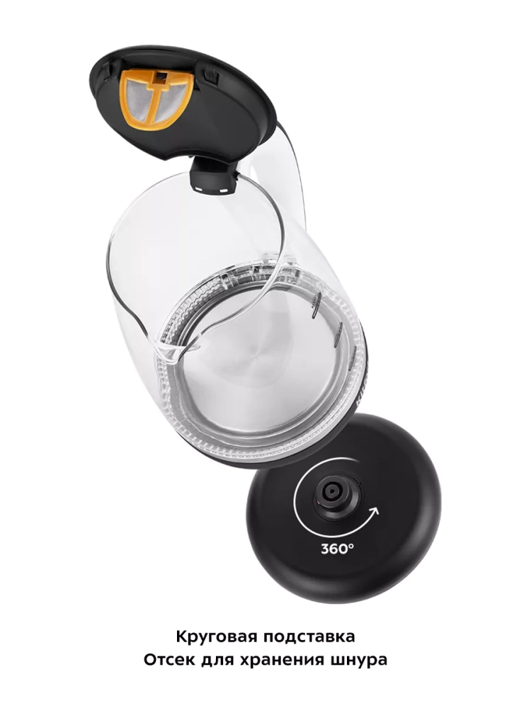 Подставка с центральным контактом дает возможность располагать на ней чайник на нее в любом положении, обеспечивая вращение на 360°. Снизу имеется отсек для хранения шнура, в который можно смотать излишки шнура электропитания, чтобы он не мешался на столе.