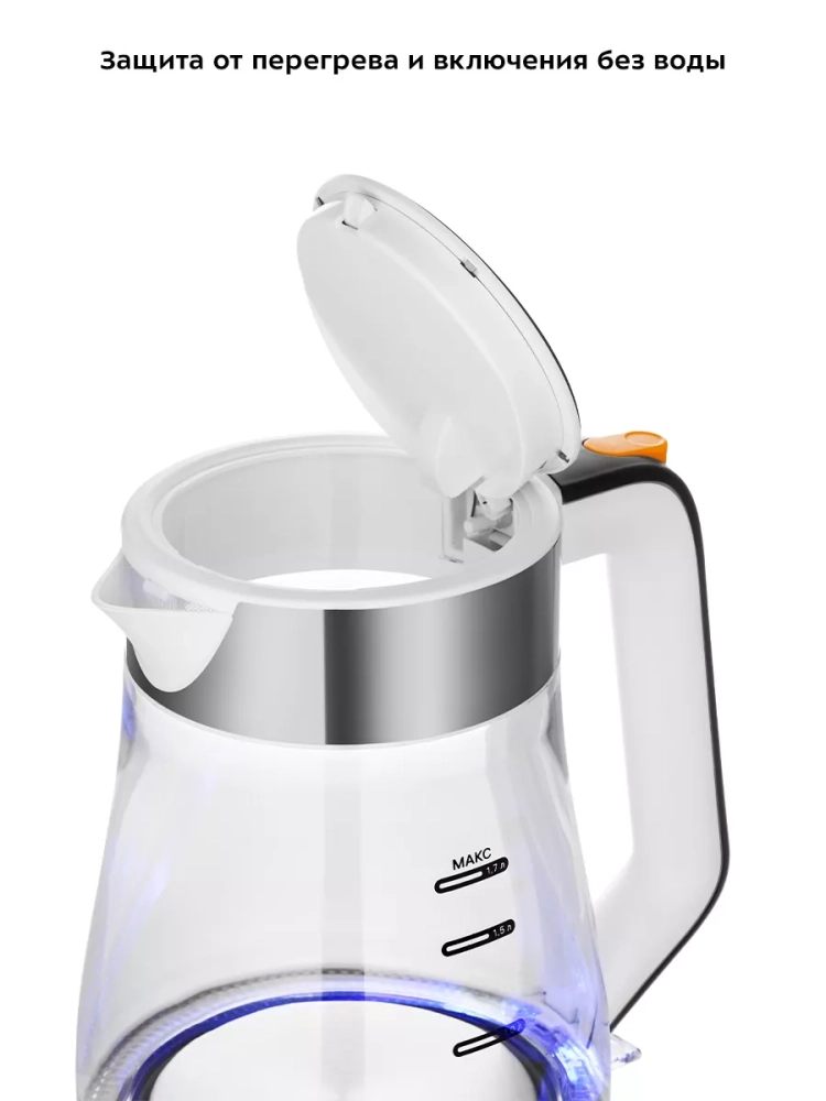 Чайник автоматически отключается при закипании, имеет защиту от перегрева и от включения без воды.