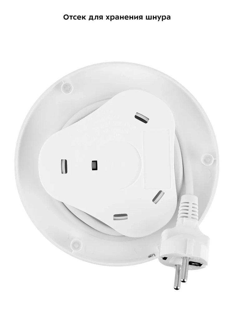 Подставка с центральным контактом дает возможность располагать на ней чайник в любом положении, обеспечивая вращение на 360°. Снизу имеется отсек для хранения шнура, в который можно смотать излишки шнура электропитания, чтобы он не мешал на столе.