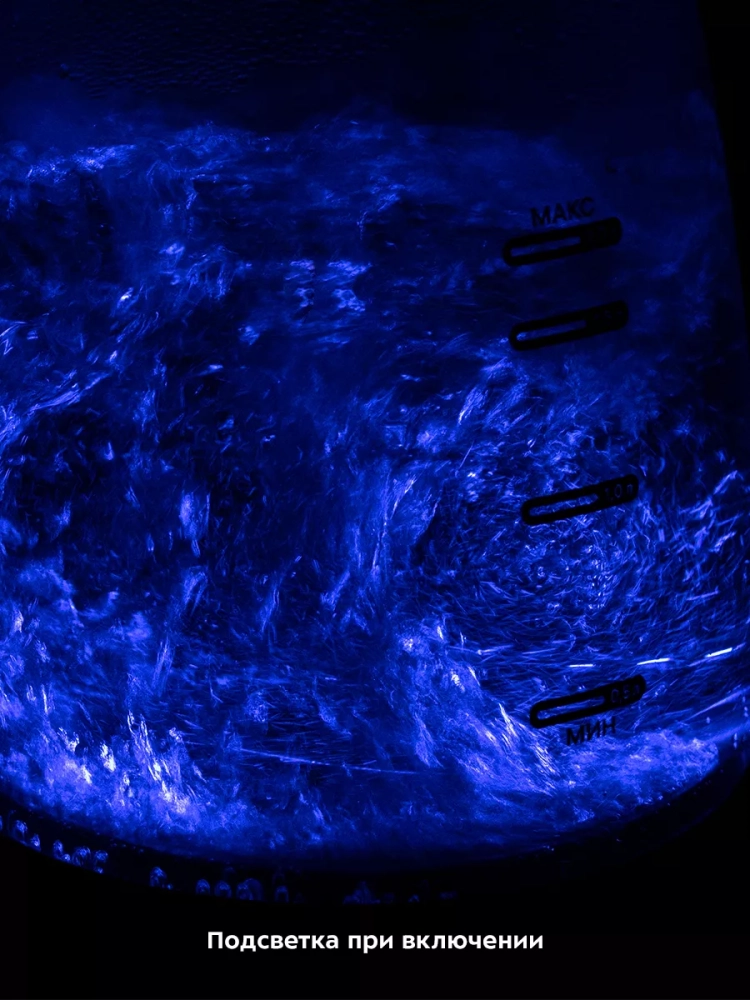 Чайник автоматически отключается при закипании и при снятии с подставки, имеет защиту от перегрева и от включения без воды.